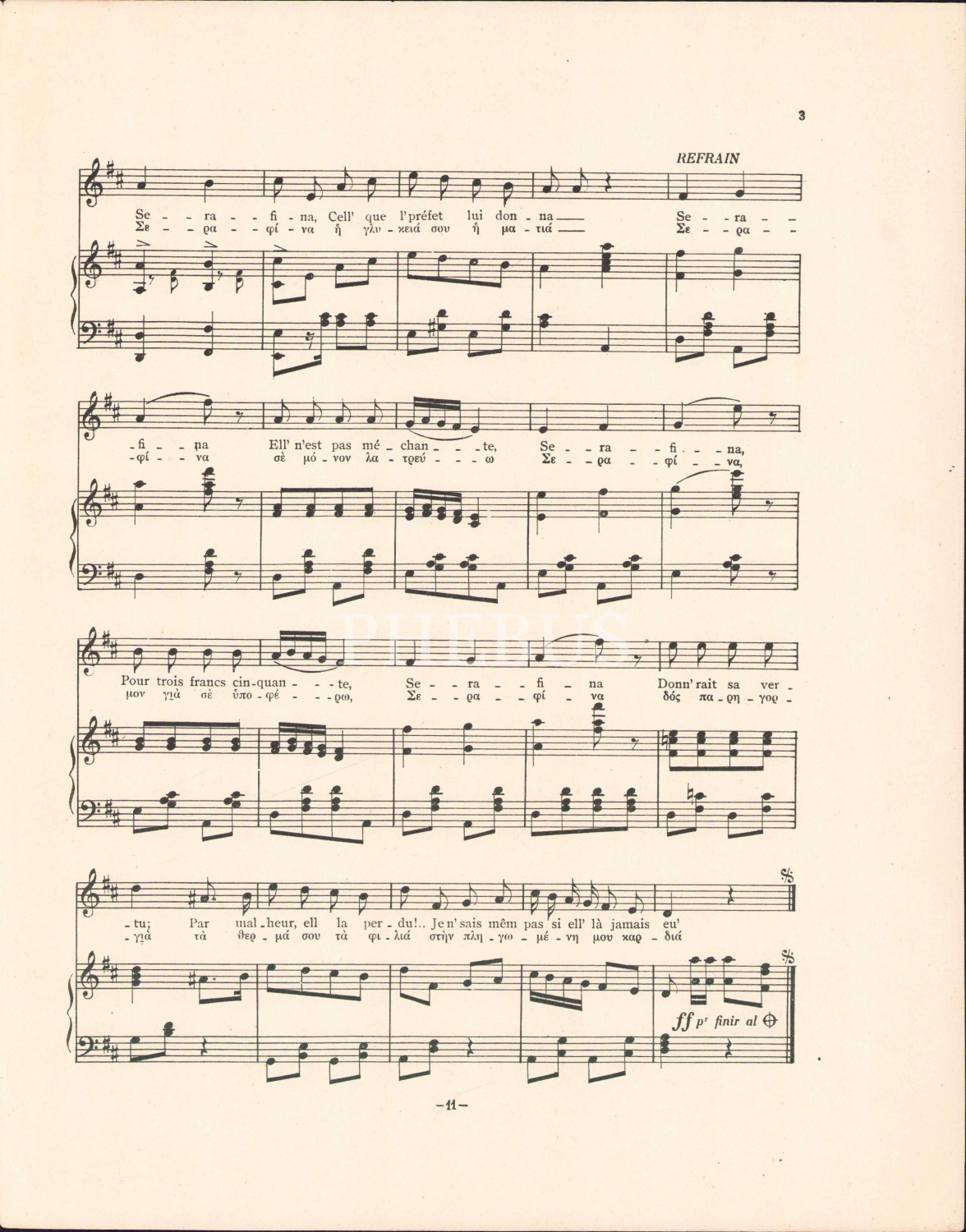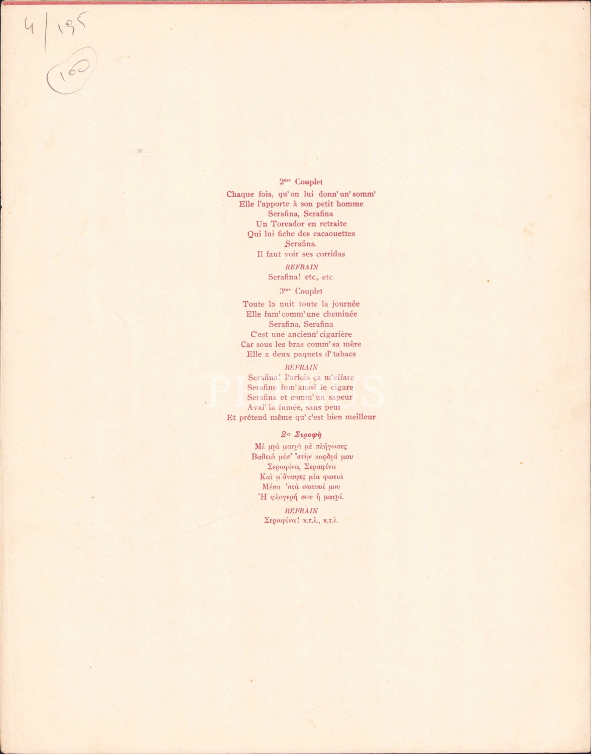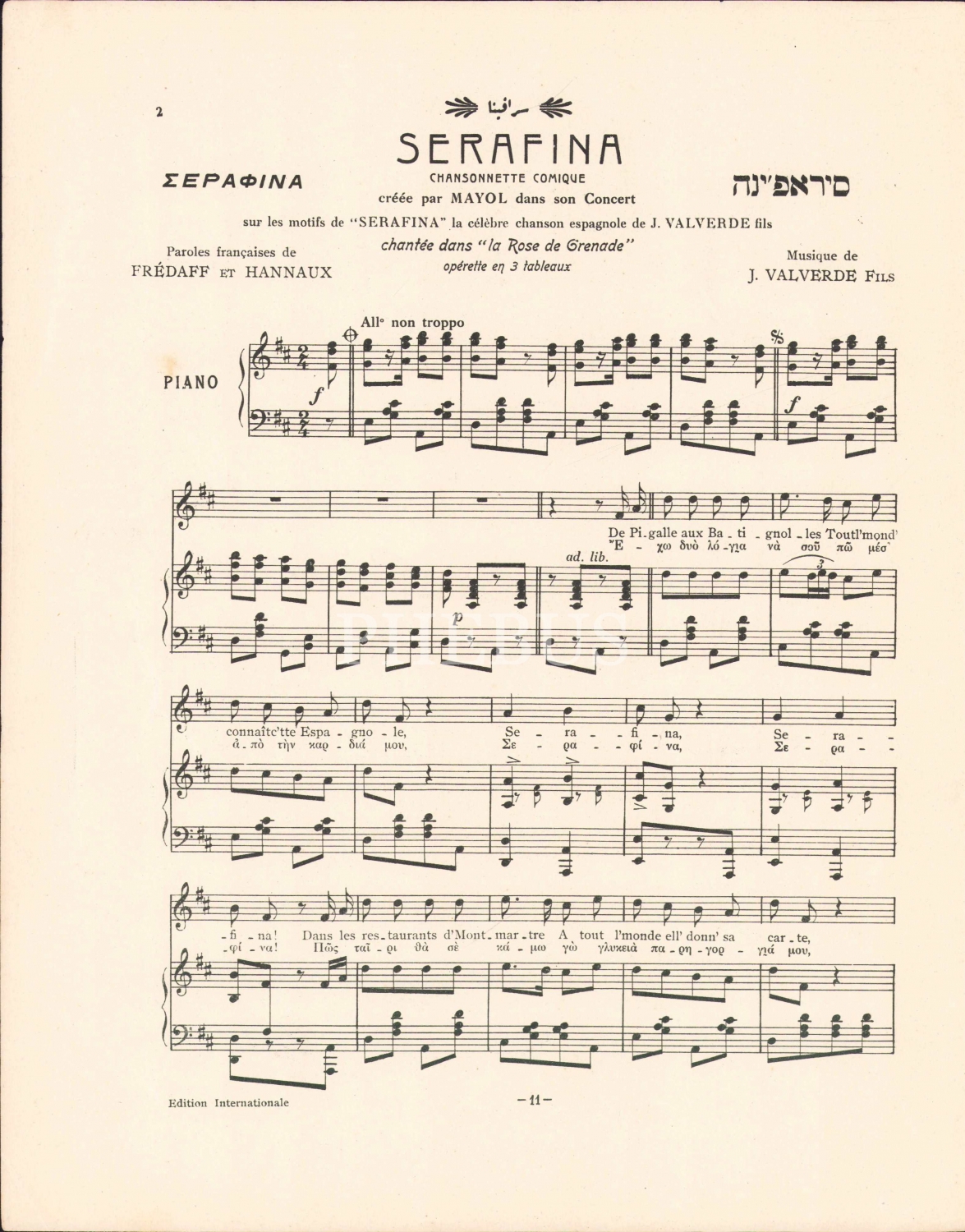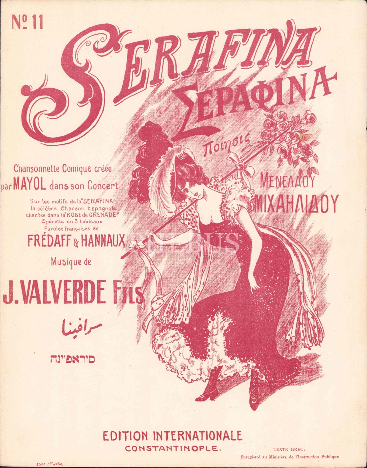 Constantinople baskı, İbranice, Osmanlıca, Ermenice, Fransızca ve Rumca beş dilde Serafina şarkı notası, editör J. Valverde Fils, 4 sayfa, 26x33 cm