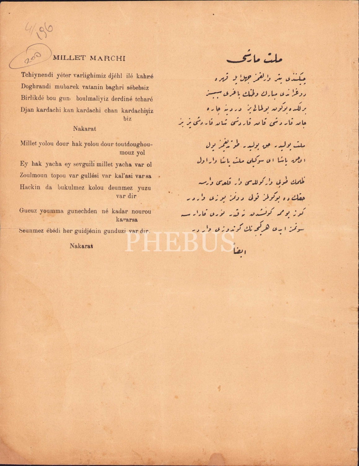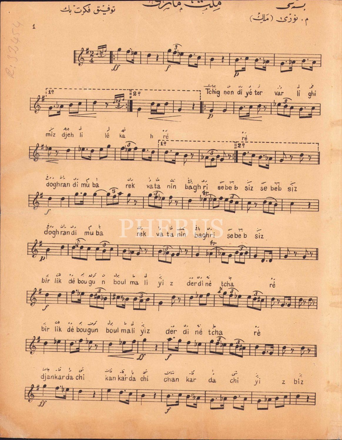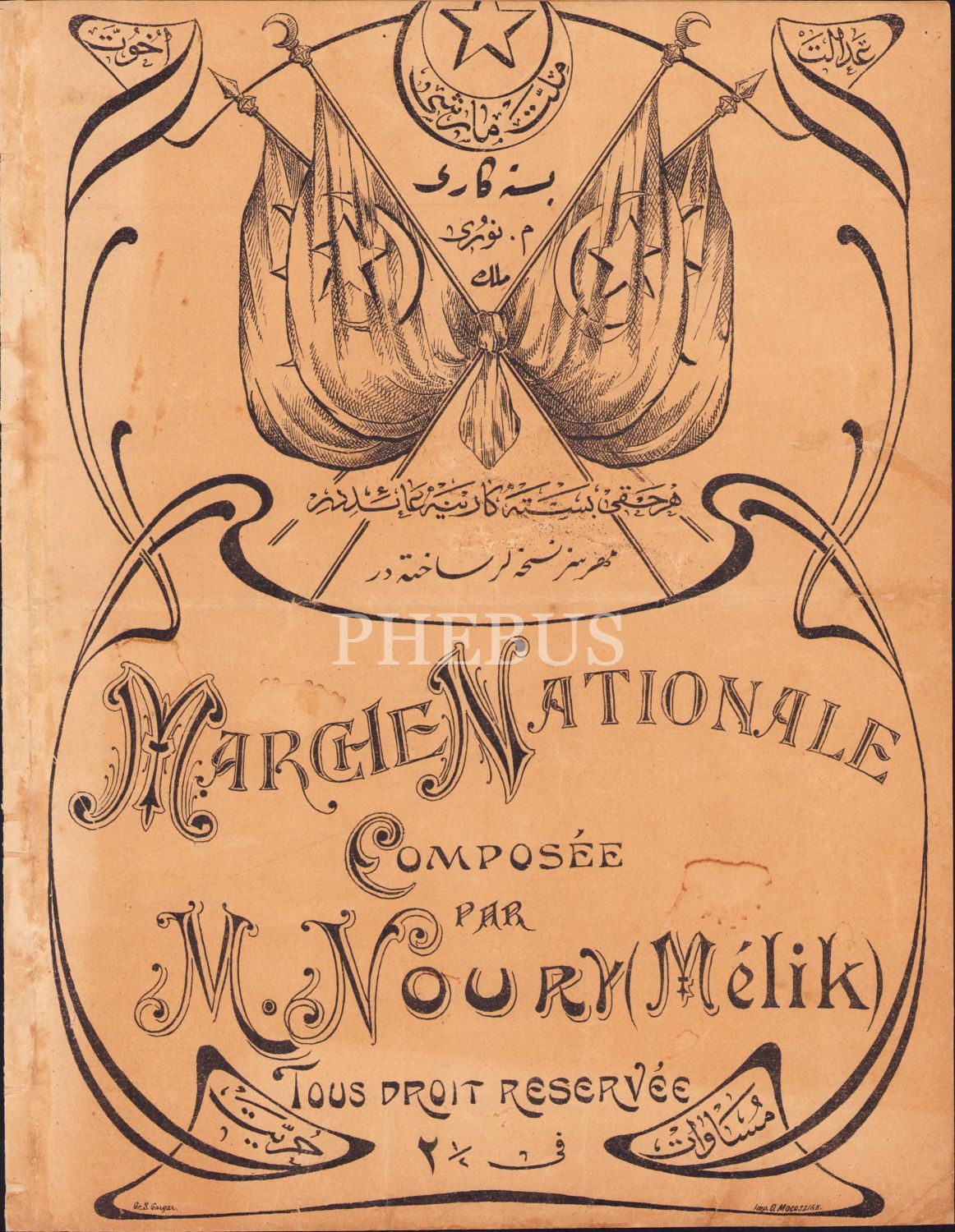 Osmanlıca - Fransızca Millet Marşı notası, M. Nuri Melik, kapak kenarlarında Adalet - Uhuvvet - Müsavat - Hürriyet yazılı, 4 sayfa, 22x30 cm
