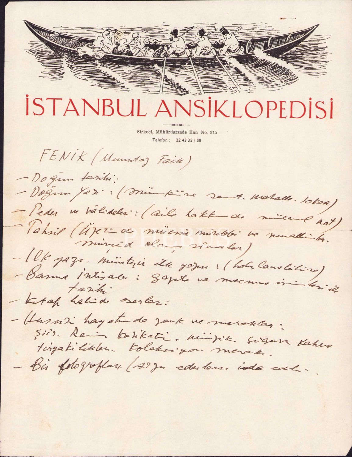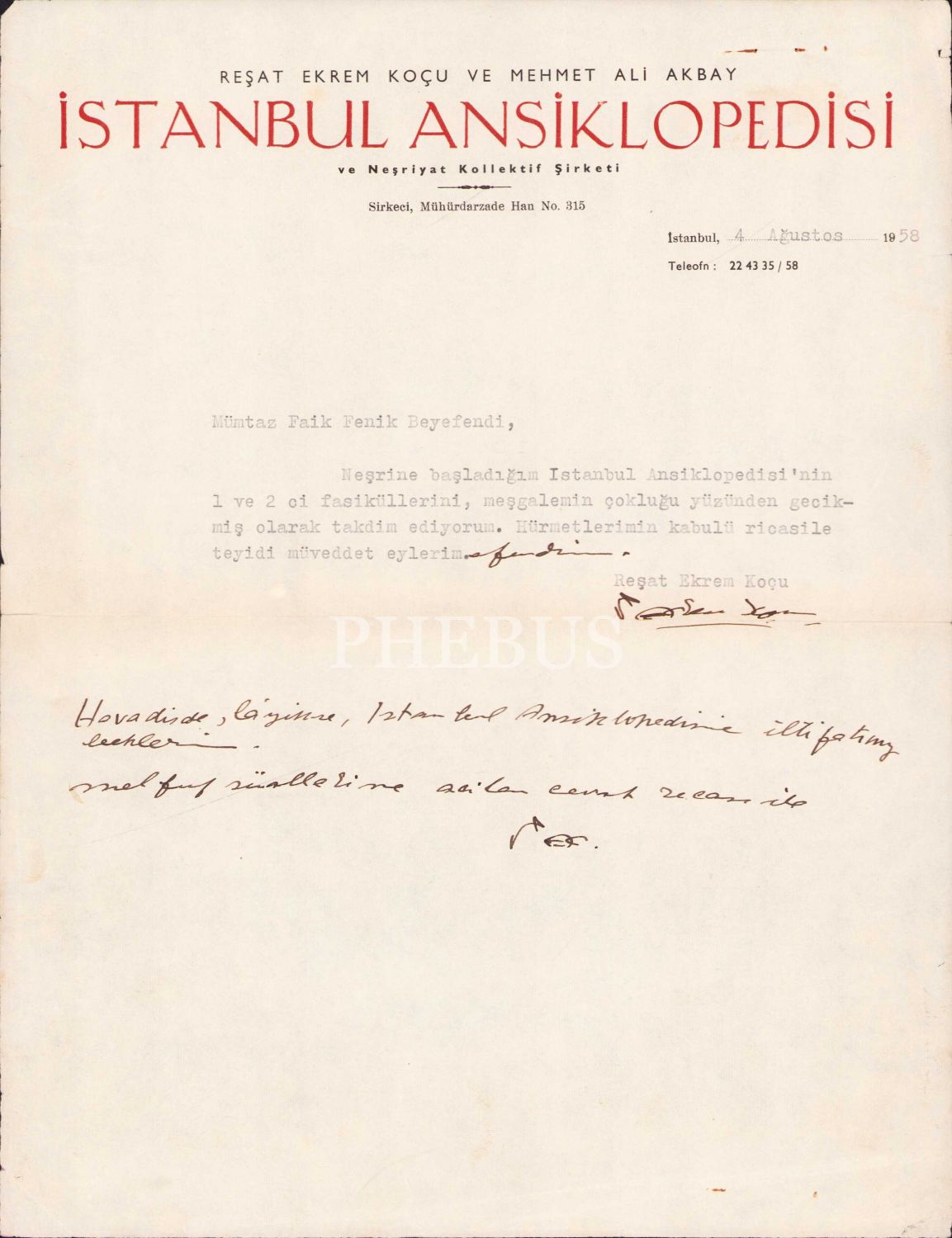Reşad Ekrem Koçu'nun kaleme aldığı İstanbul Ansiklopedisi[ Birinci Cilt] ve 2 adet İstanbul Ansiklopedisi antetli dokümanda Mümtaz Faik Fenik Efendiye gönderilmiş, ansiklopedinin 1. ve 2. cildinin gecikmesine dair mazeret mektubu, Koçu'dan imzalı