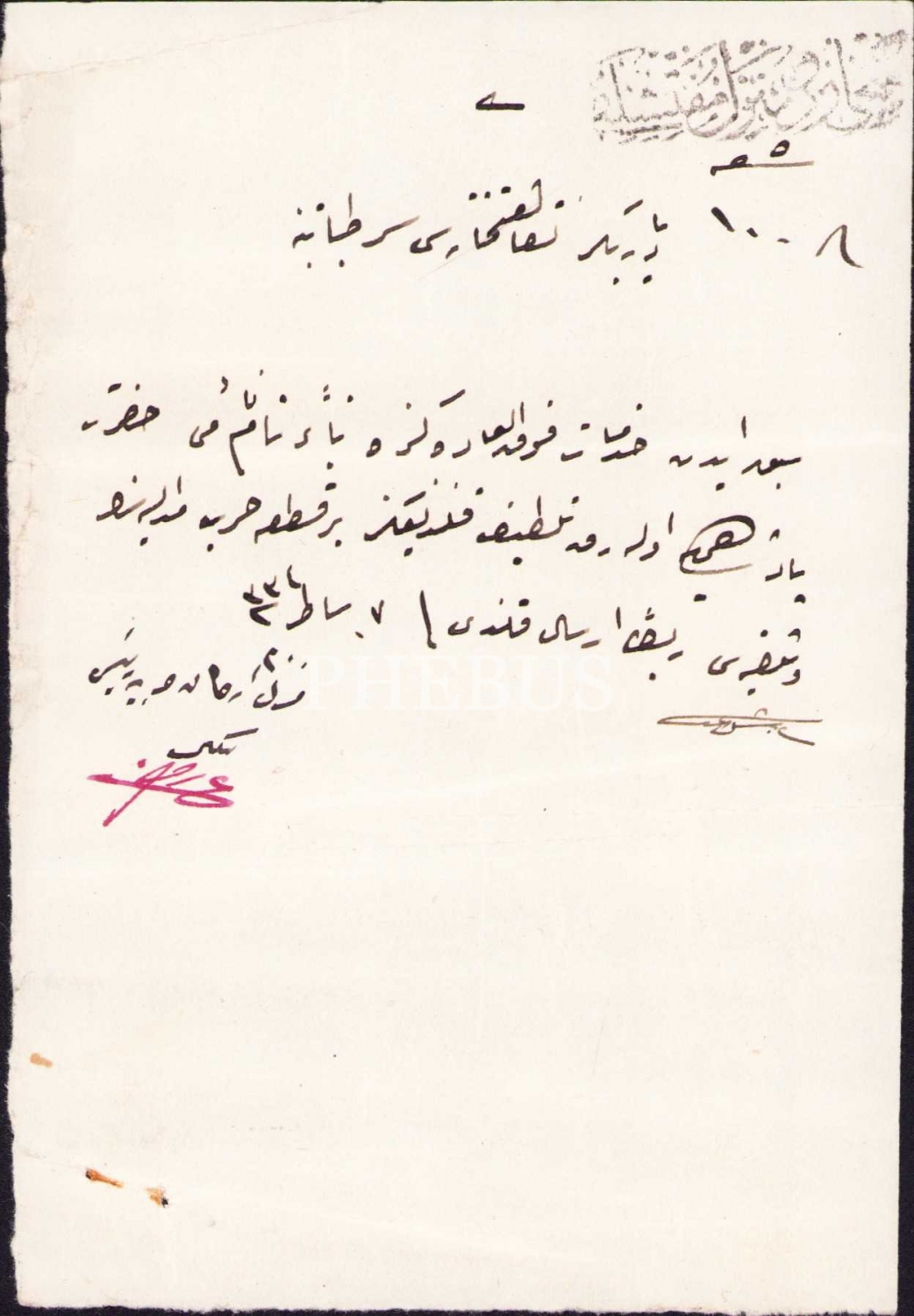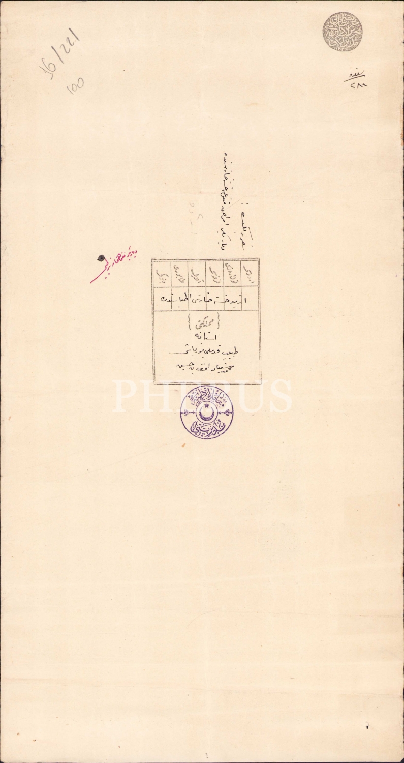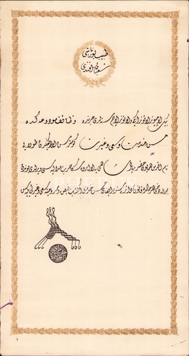 Enver Paşa mühürlü, Diyarbakır Karantina bölgesinde yaptığı hizmetlerden dolayı Tabib Yüzbaşı Şaban Efendi'ye verilmiş Osmanlıca [1913- 1914]Harp madalyası beratı, 22x42 cm