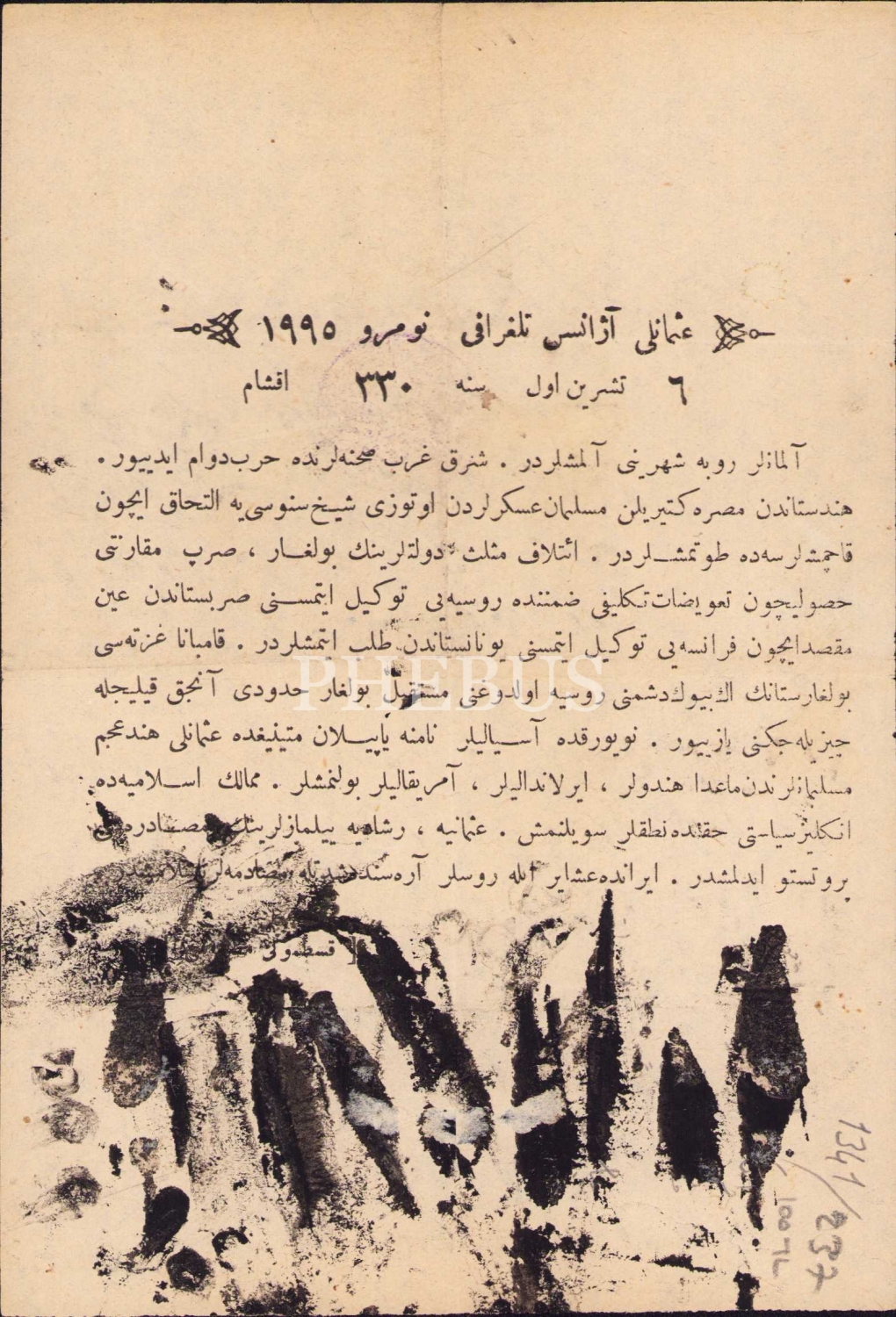 Osmanlı Telgraf Ajansı - 1914 yılı Osmanlıca Birinci Dünya Savaşı Bülteni, No. 1995, 13x19 cm