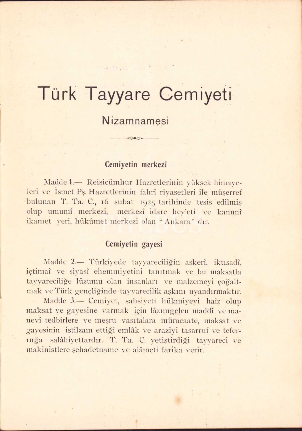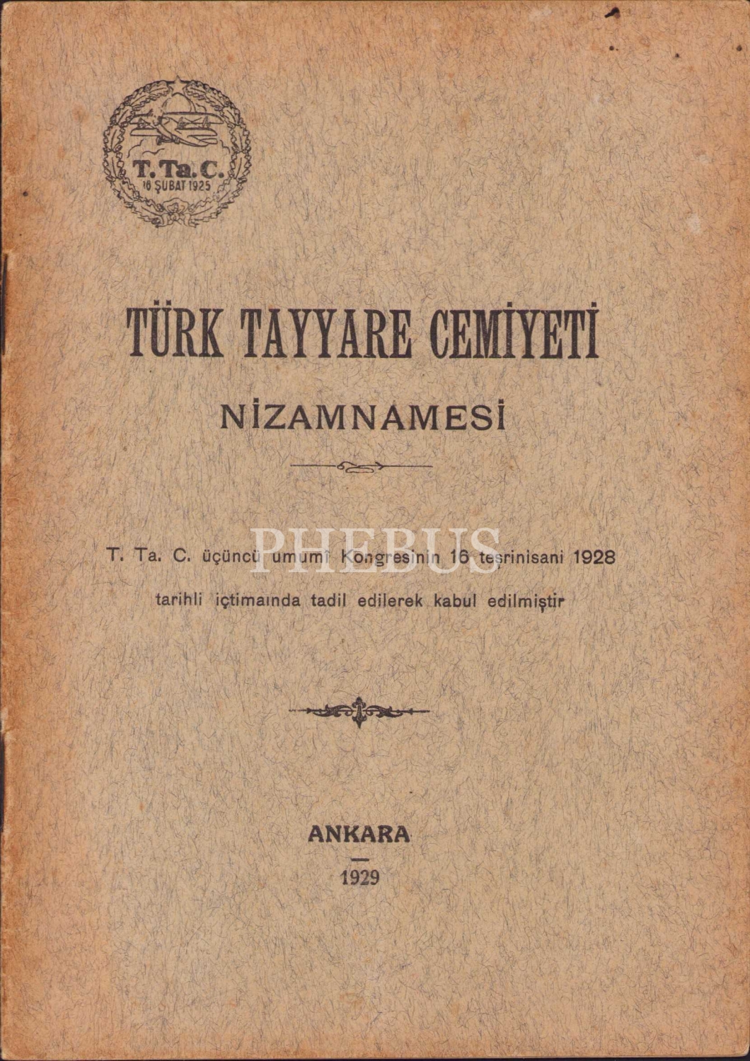 Türk Tayyare Cemiyeti Nizamnamesi, Zelliç Biraderler Matbaası, Ankara 1929, 19 sayfa, 13x19 cm