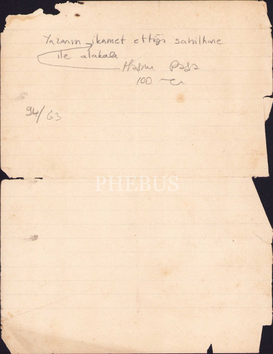 Maarif Nazırı Haşim Paşa'nın el yazısıyla Osmanlıca belge, ikamet ettği sahilhane ile ilgili, 16x20 cm