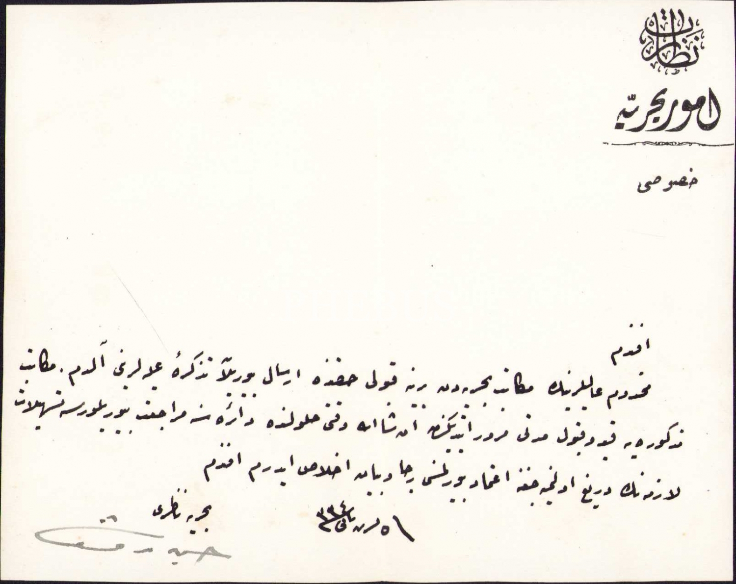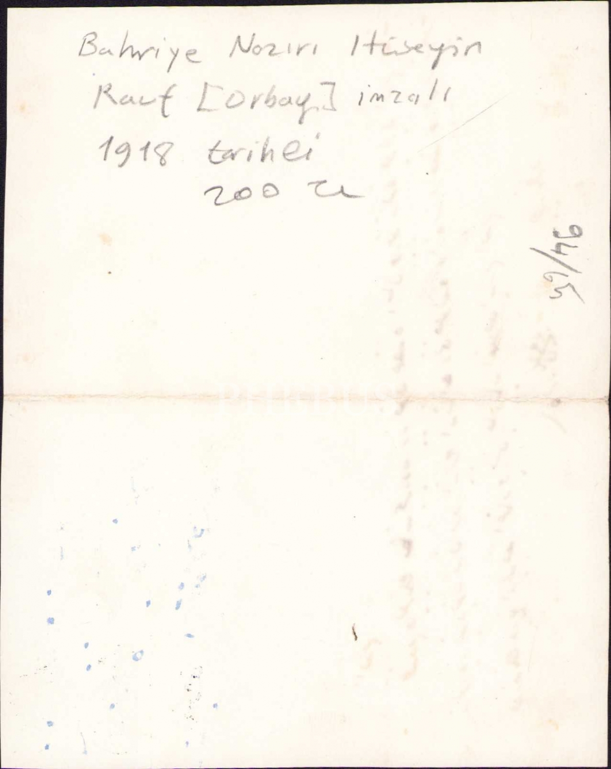 Bahriye Nazırı Hüseyin Rauf [Orbay]'dan imzalı 1918 tarihli Osmanlıca belge, 14x11 cm