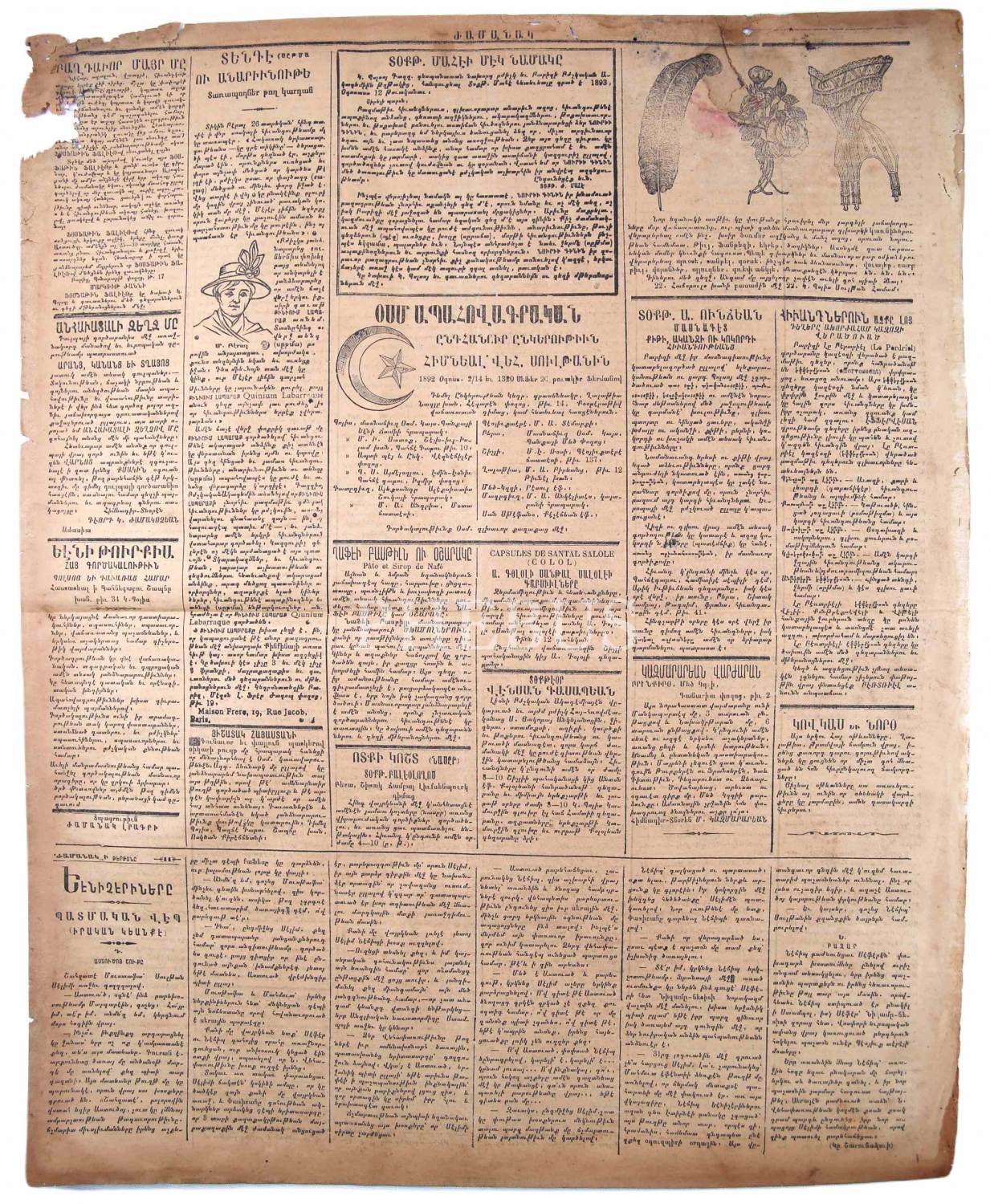 Ermenice Jarmanak Günlük ve Siyasi Mecmua, "Adana Katliamı ve Şeriatı", "Hürriyet Daimidir Askerlerin Ulemaların ve Halkın İstekleri", 4-17 Nisan 1909 tarihli, haliyle, 4 sayfa, 44x56 cm