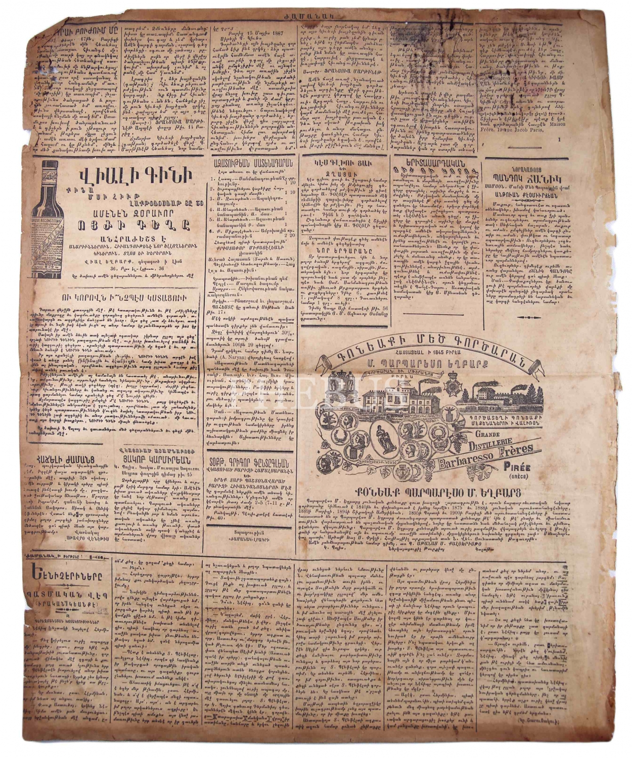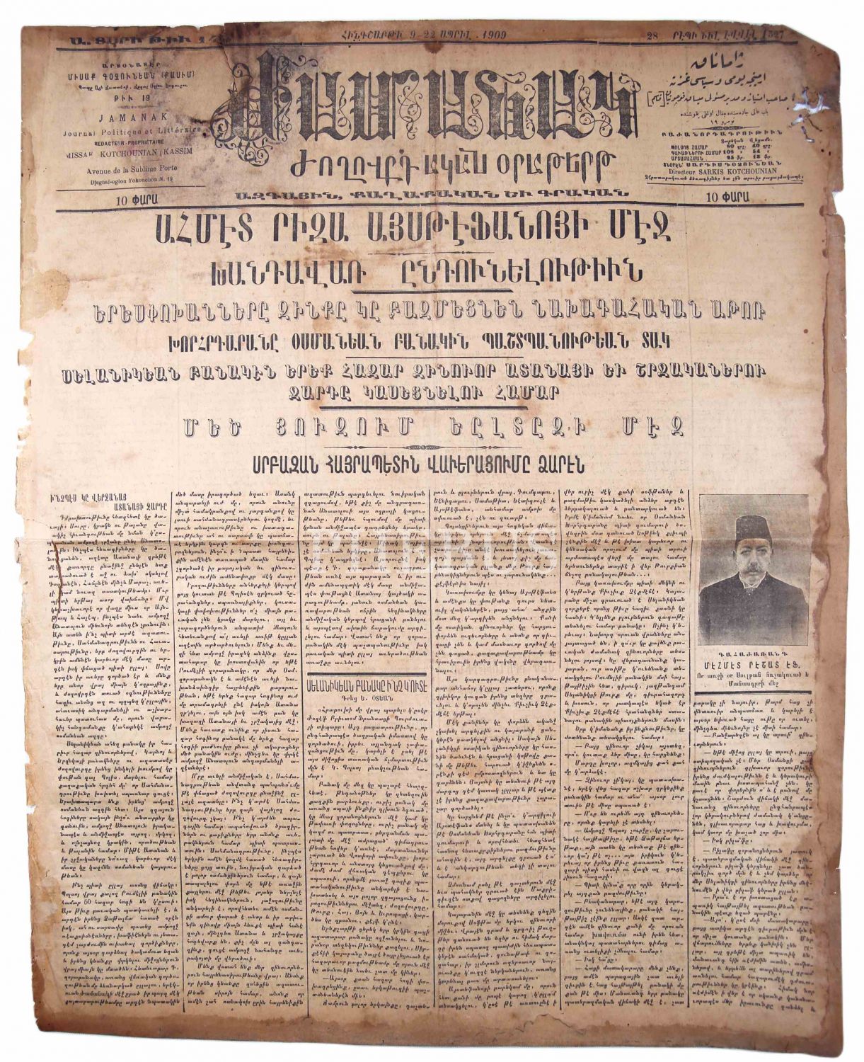 Ermenice Jarmanak Günlük ve Siyasi Mecmua, "Yıldız Sarayı'nda Büyük Hüzün", "Ahmed Rıza Ayestefanos'ta Görkenli Karşılama, "Adana İsyanı", 1909 tarihli, haliyle, 4 sayfa, 44x56 cm