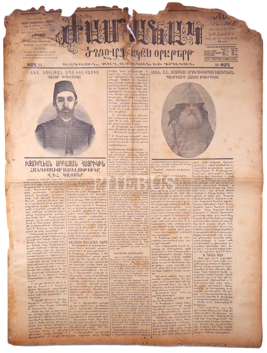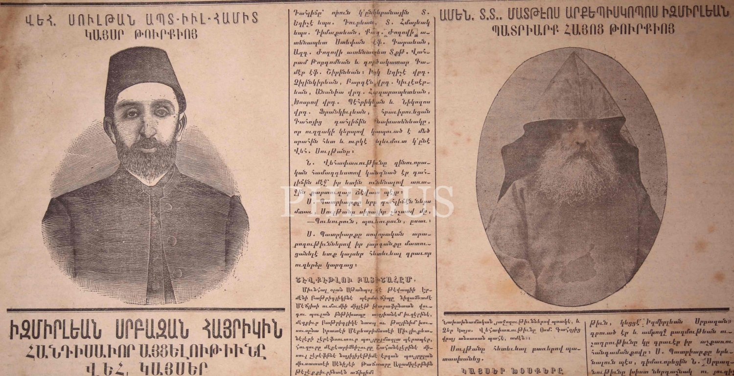Ermenice Jarmanak Günlük ve Siyasi Mecmua, "Sultan Abdülhamid Matteos İzmirliyan İstanbul Ermeni Patriği", 1909 tarihli, haliyle, 4 sayfa, 44x56 cm