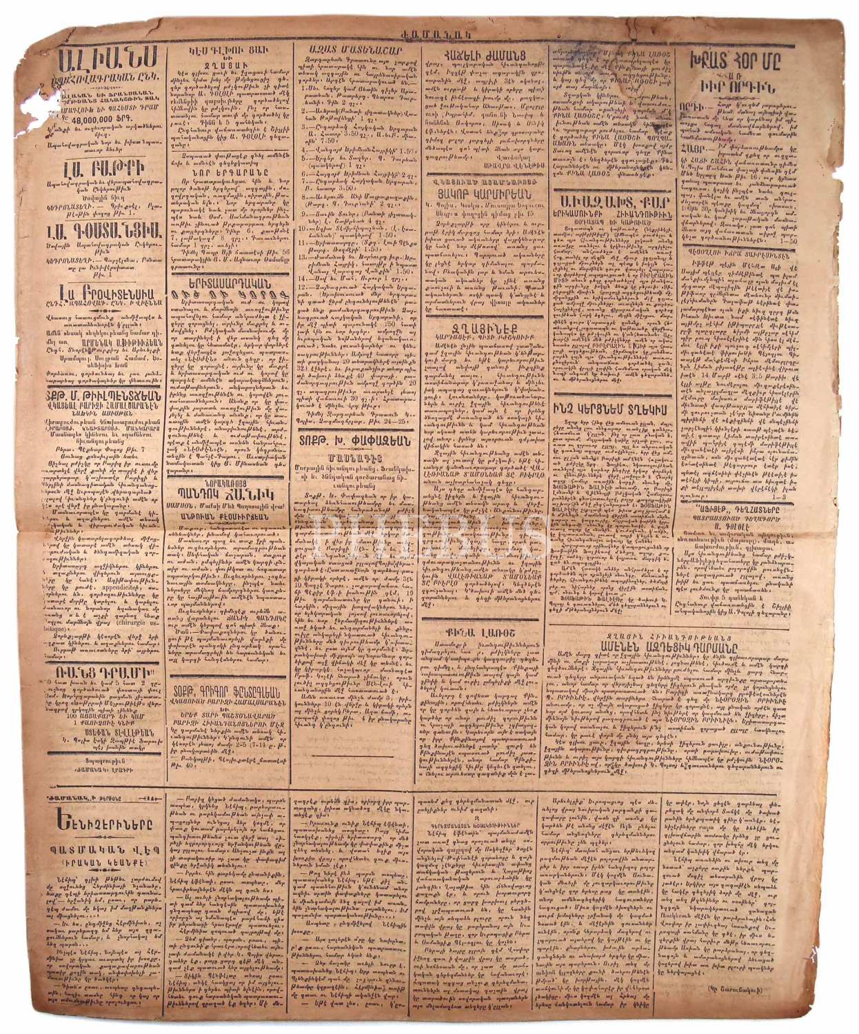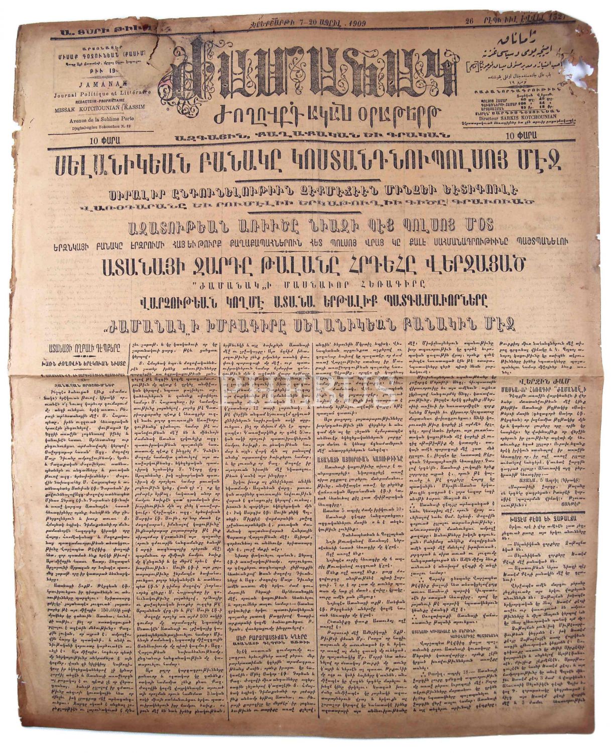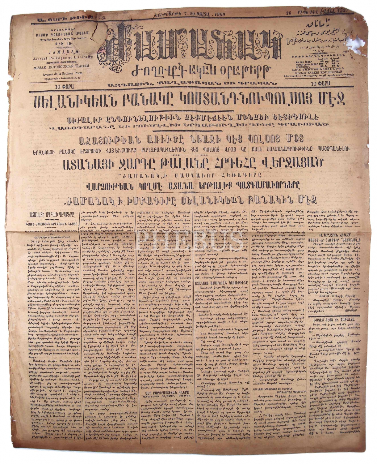 Ermenice Jarmanak Günlük ve Siyasi Mecmua, "Selanik Birliği İstanbul'da Hürriyet Aslanı [Resneli] Niyazi Bey İstanbul'da, Adana Katliamı ve Talanı", 7-20 Nisan 1909 tarihli, haliyle, 4 sayfa, 44x56 cm