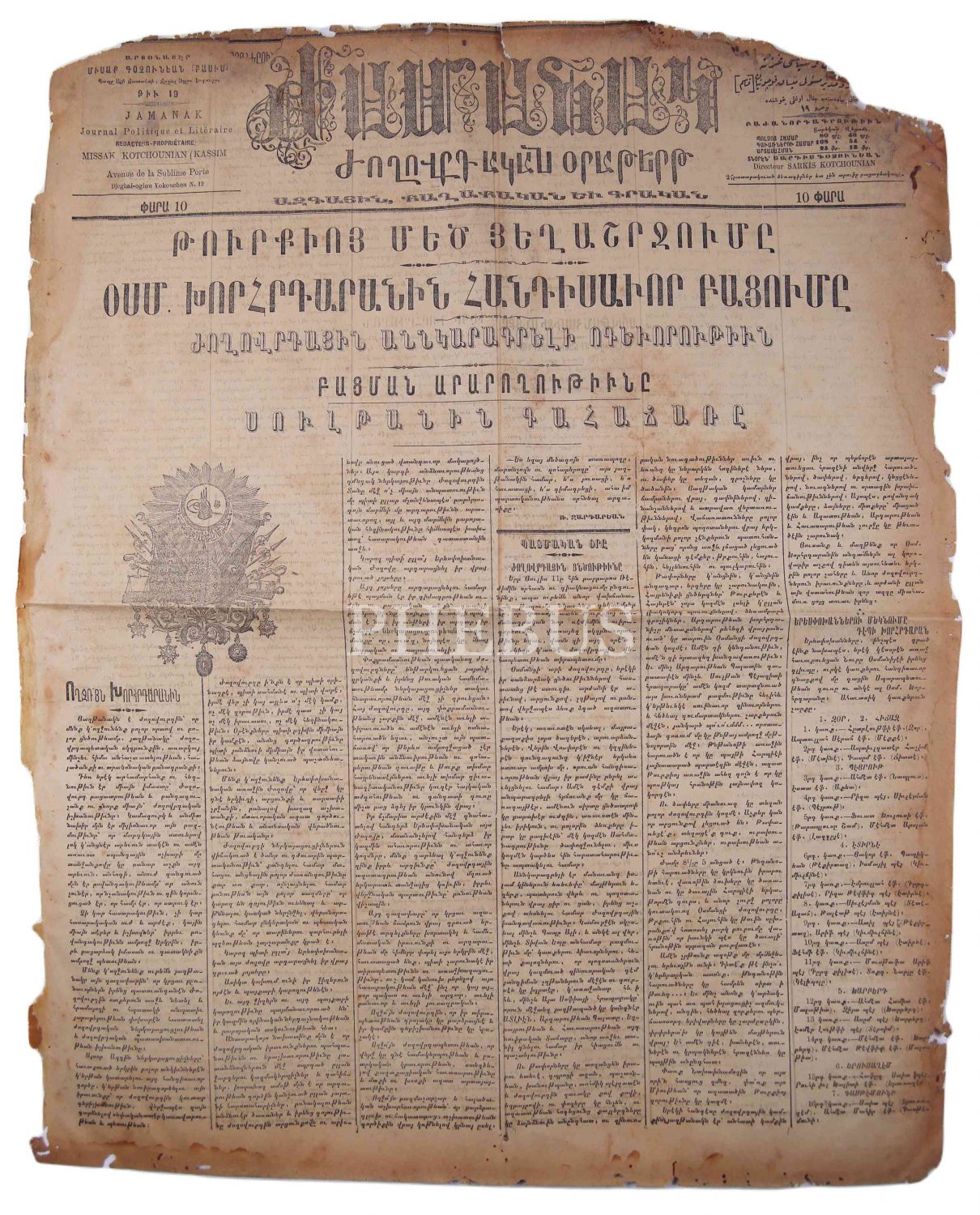 Ermenice Jarmanak Günlük ve Siyasi Mecmua, "Türkiye'nin Büyük Reformu Osmanlı Meclisi'nin Görkemli Açılışı", 1909 tarihli, haliyle, 4 sayfa, 44x56 cm