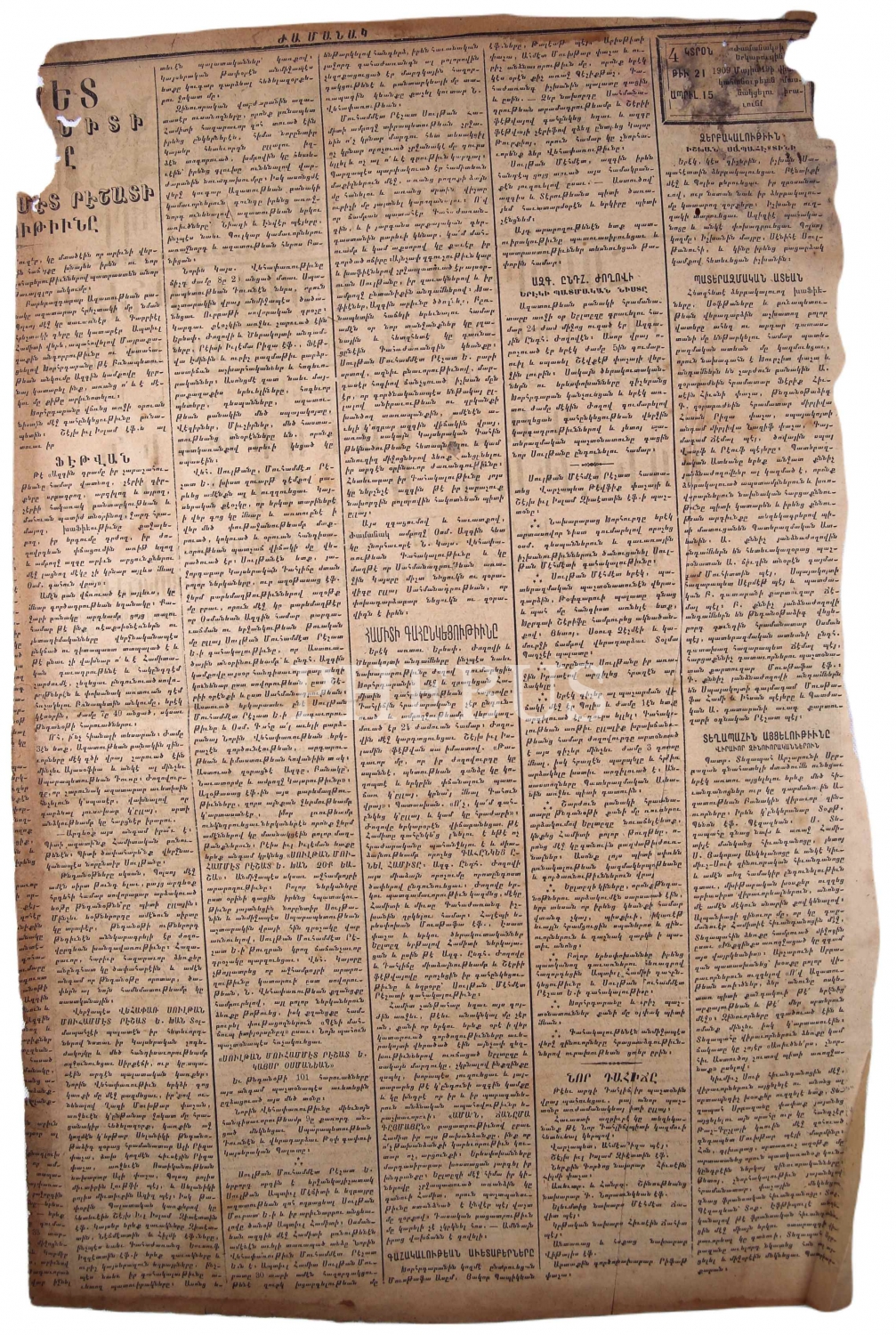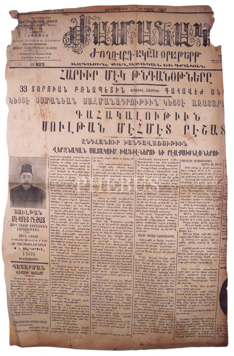 Ermenice Jarmanak Günlük ve Siyasi Mecmua, "101 Pare Top Atışı İle 33 Senelik Despotun Tahttan İndirilmesi","Sultan Mehmed Reşad'ın Tahta Çıkması", 15-22 Nisan 1909 tarihli, haliyle, 4 sayfa, 44x56 cm