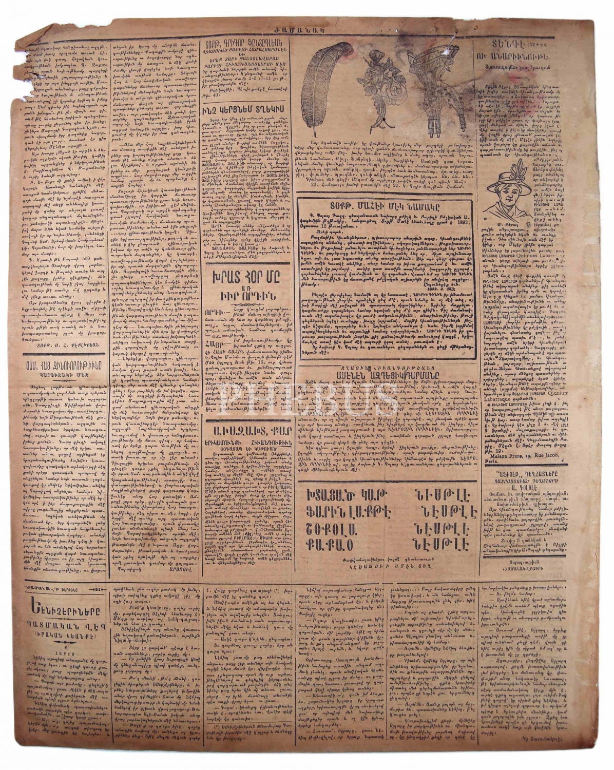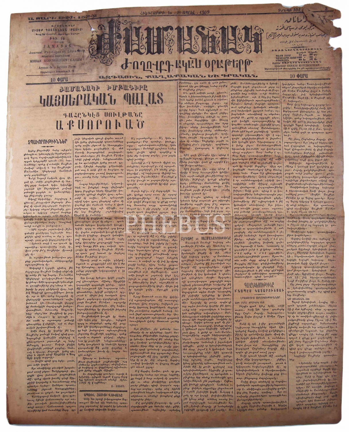 Ermenice Jarmanak Günlük ve Siyasi Mecmua, "Sultan Abdülhamid'in Tahttan İndirilmesi", 20 Nisan 1909 tarihli, haliyle, 4 sayfa, 44x56 cm