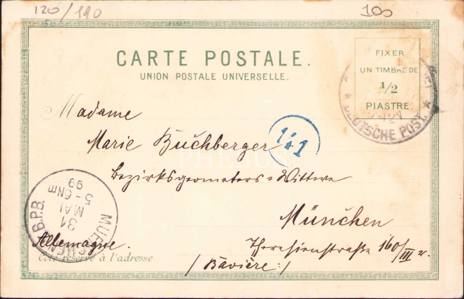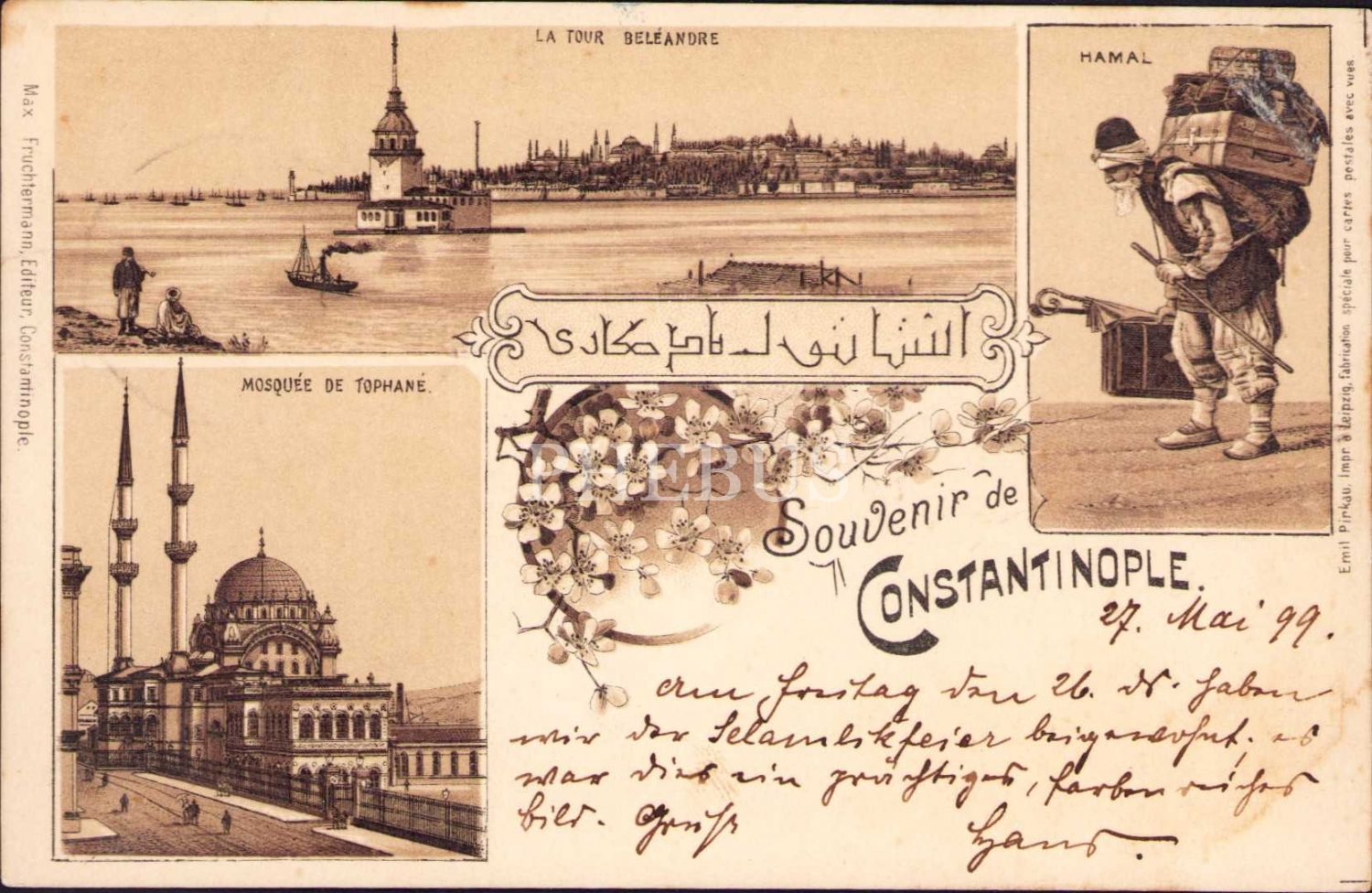 Osmanlı dönemi parçalı kartpostal, Kız Kulesi, Tophane Camii, Hamal, Editör Max Fruchtermann