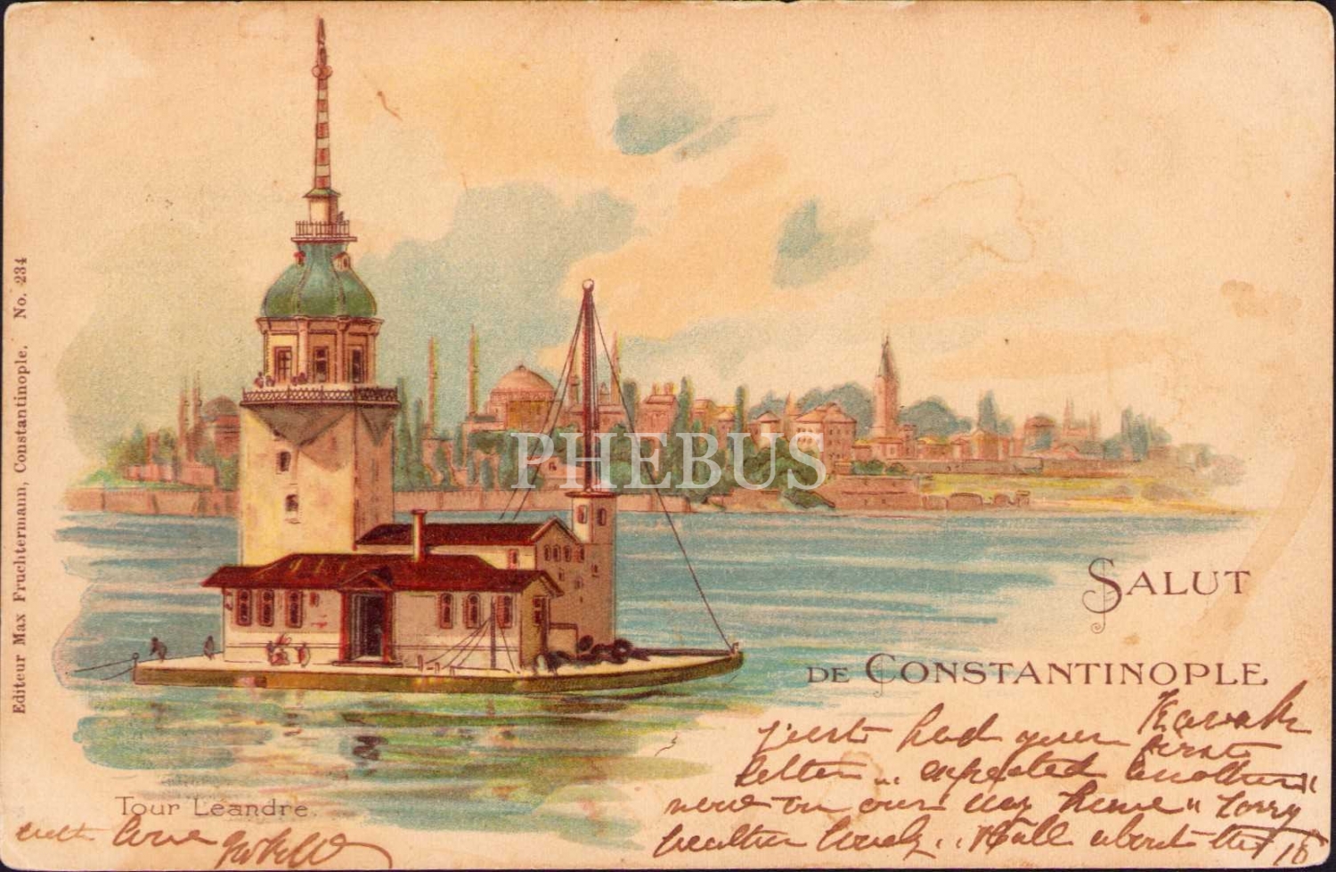 Osmanlı dönemi kartpostal, Kız Kulesi, Tophane Camii, Hamal, Editör Max Fruchtermann
