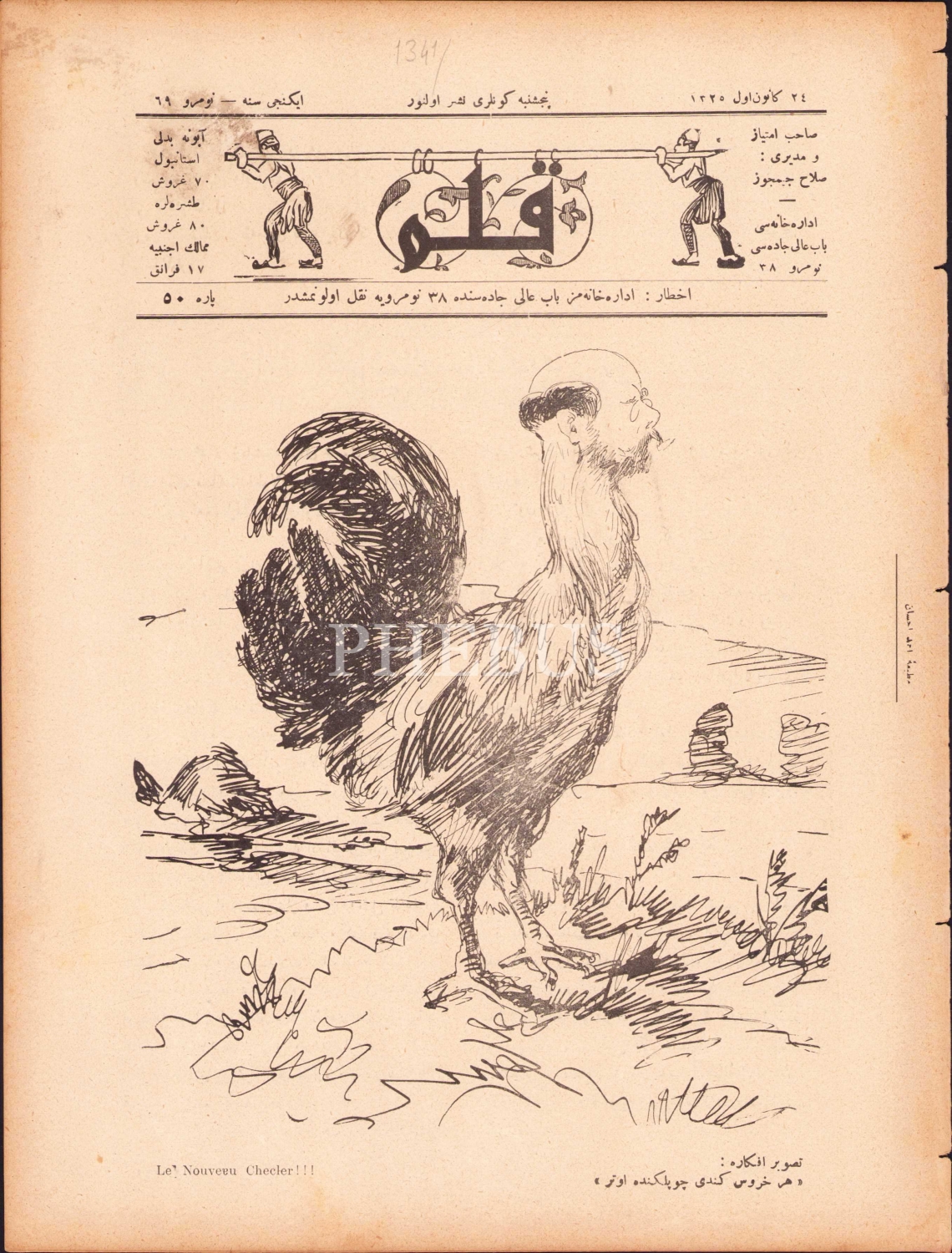 Osmanlıca Kalem Mecmuası,"Tasvir-i Efkara: Her horoz kendi çöplüğünde öter", Numara: 69, 24 Kanunuevvel 1325 tarihli, 8 sayfa, 23x30 cm