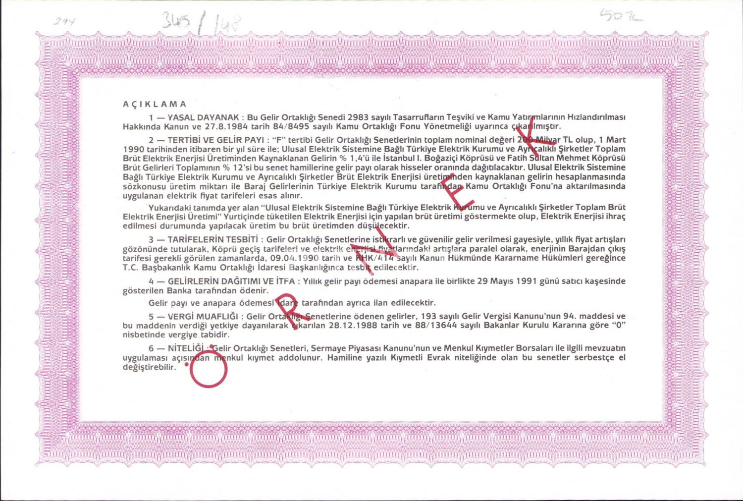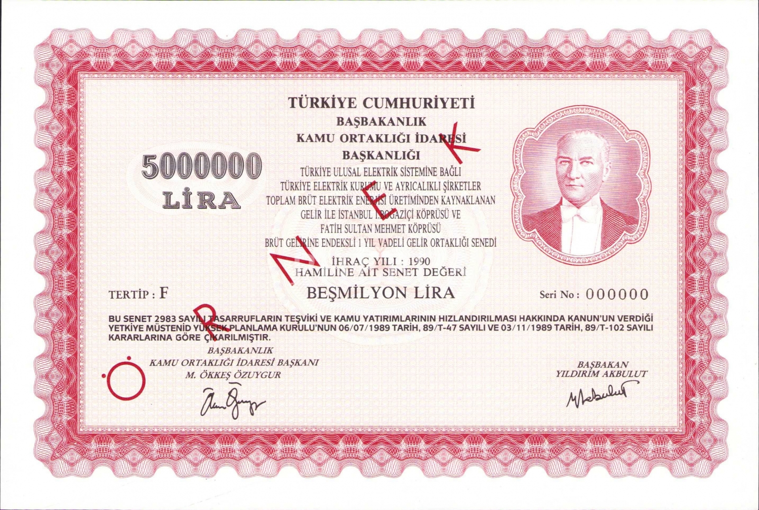 Türkiye Cumhuriyeti Başbakanlık Kamu Ortaklığı İdaresi Başkanlığı Hamiline Ait Hisse Senedi, Beş Milyon Lira, 24x17 cm