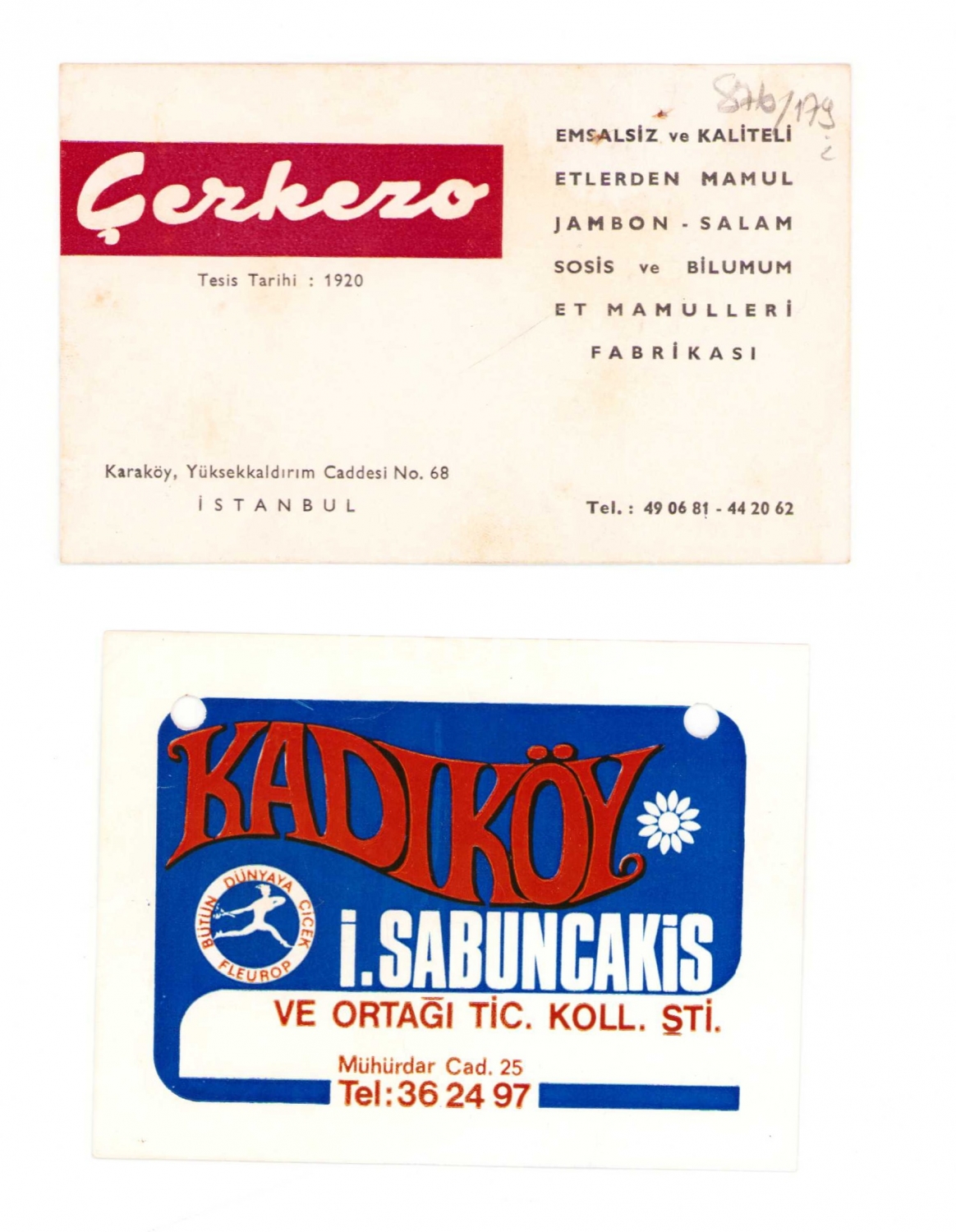 İki adet Rum ticari reklam kartı, Çerkezo ve Sabuncakis, 11x9 cm