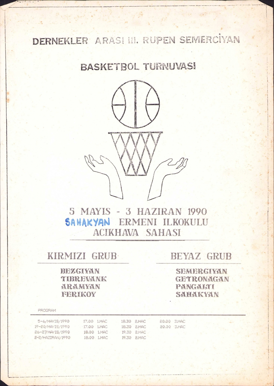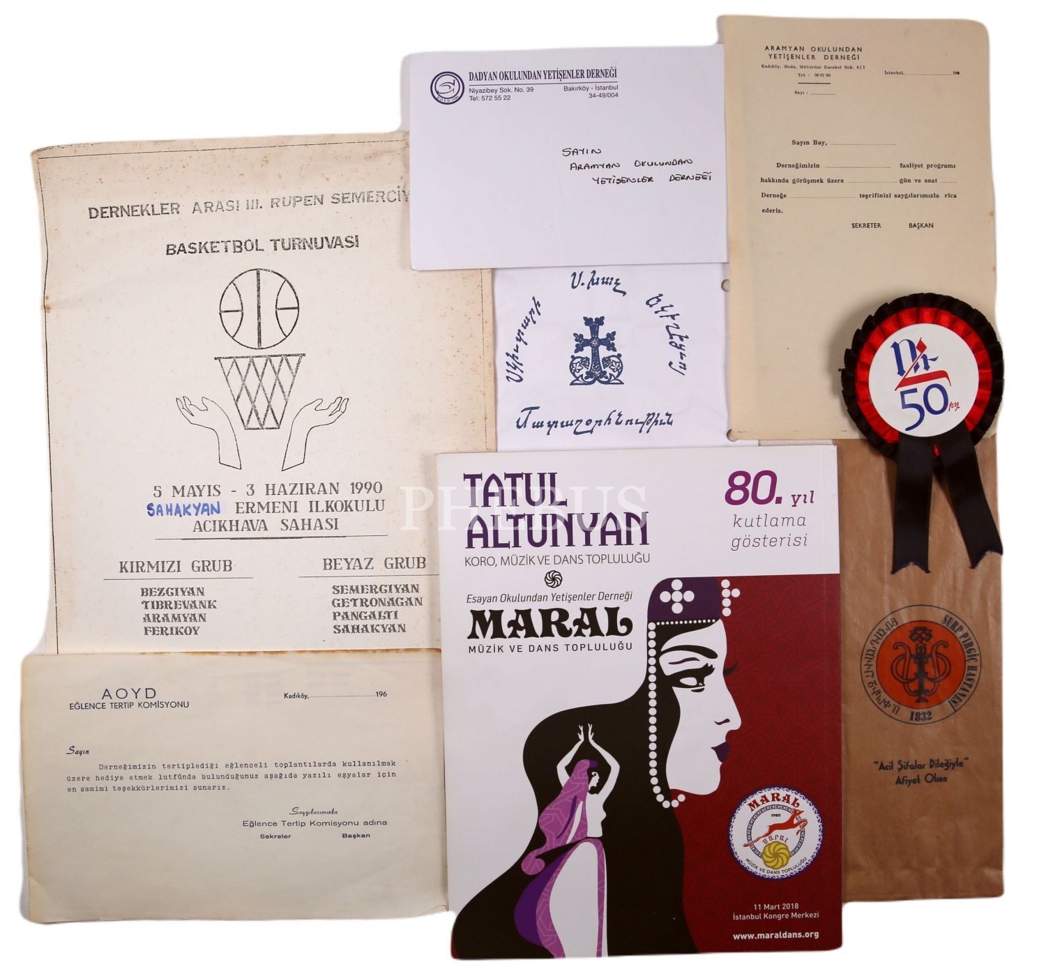 Semerciyan Basketbol Turnuvası İlan Kartonu, Dadyan Davetiye, Öğretmen Derneği Karton Rozet, Üsküdar S. Haç Kağıt Poşet, Maral Grubu Dergisi, S. Prgiç Poşeti, muhtelif ebatlarda, Ermenice