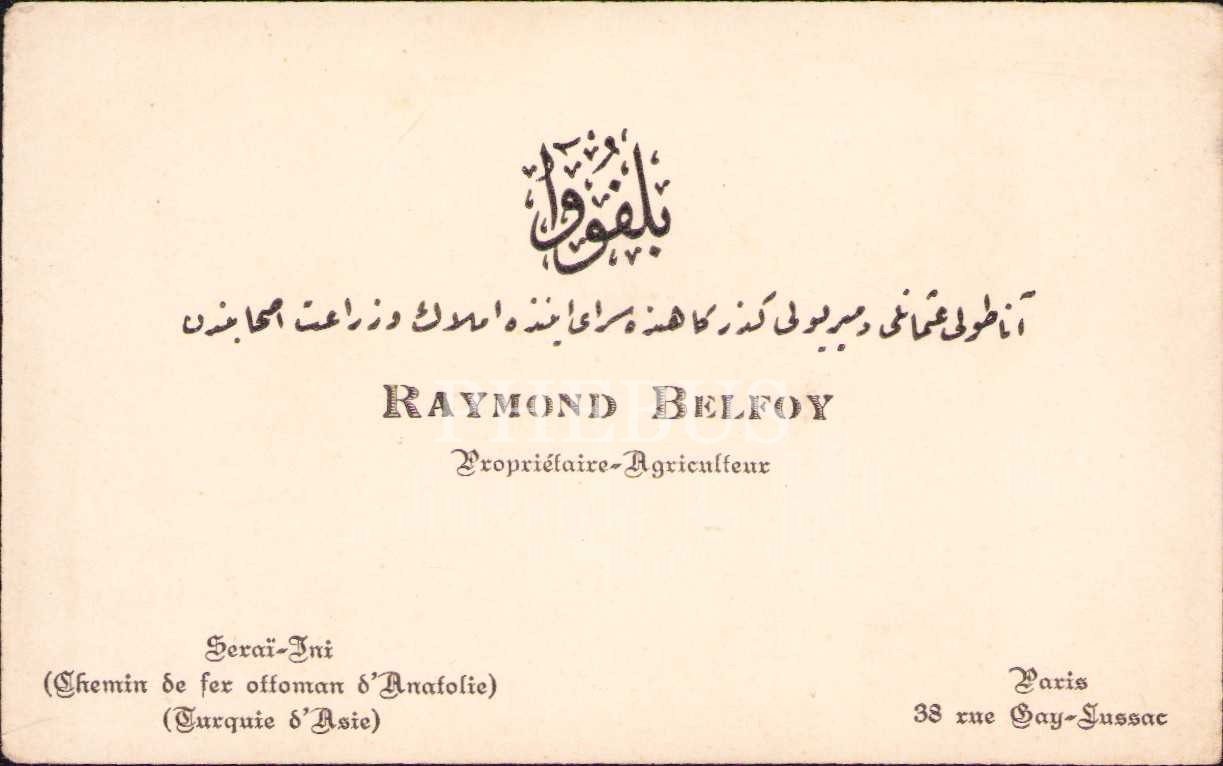 Anadolu Demiryolu Sarayköy adresli Levanten Ziraatçi Raymond Belfoy'a ait kartvizit, 10x6 cm