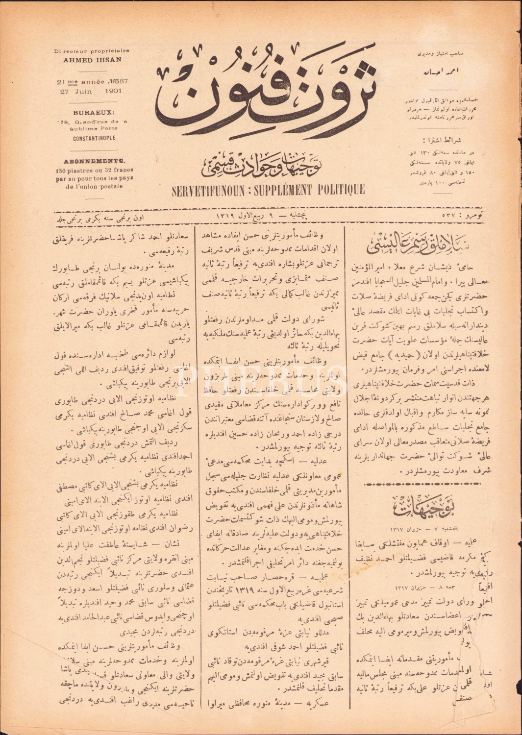 Osmanlıca Servet-i Fünun mecmuası, 9 Rebiülevvel 1319 tarihli, 8 sayfa, 25x33 cm