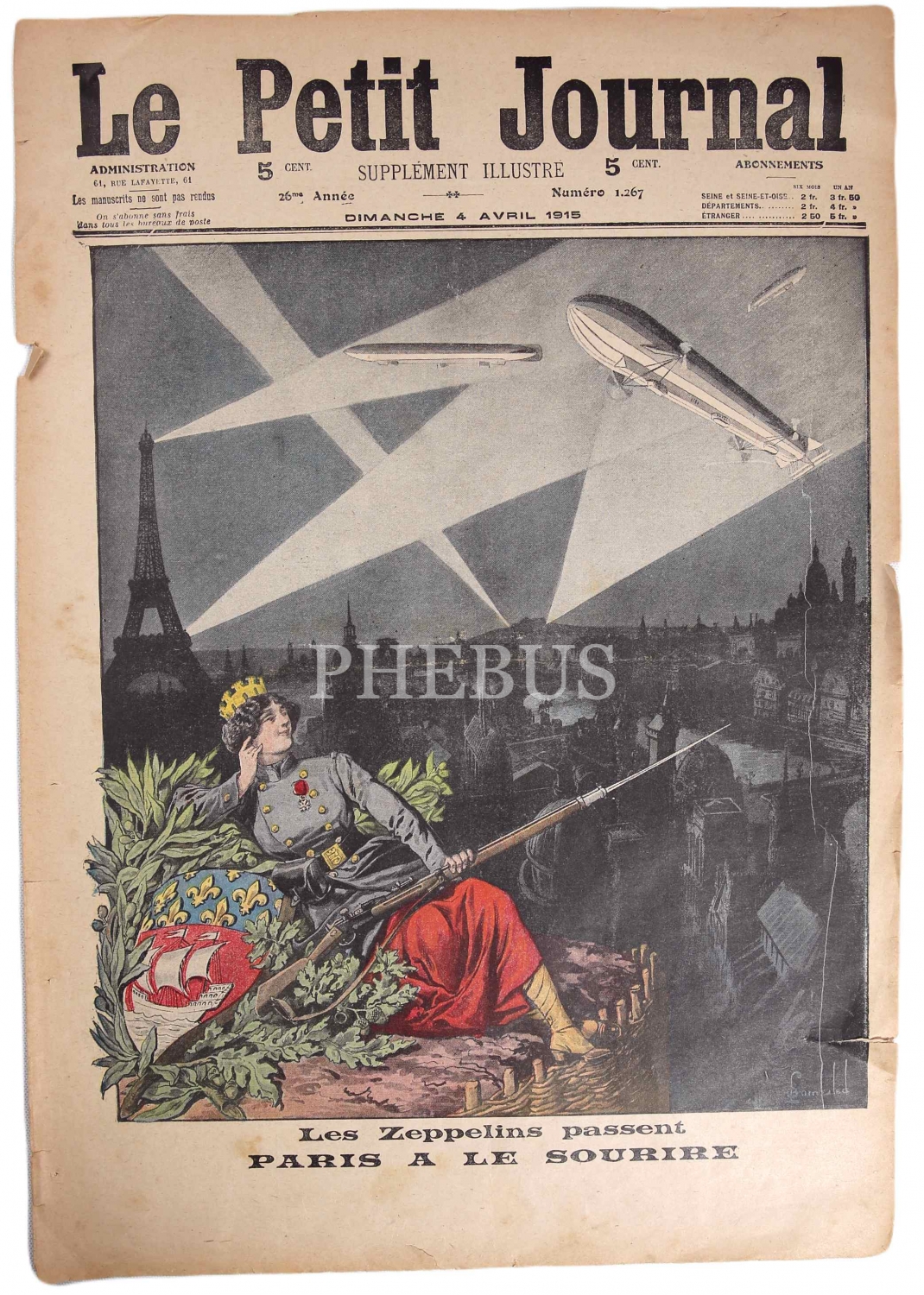 Fransızca Le Petit Journal dergisi, 4 Nisan 1915 tarihli, Kapak: Paris'te Zeplin, arka kapak Çanakkale savaşından Osmanlı topçu bataryaları, 8 sayfa, haliyle, 30x44 cm