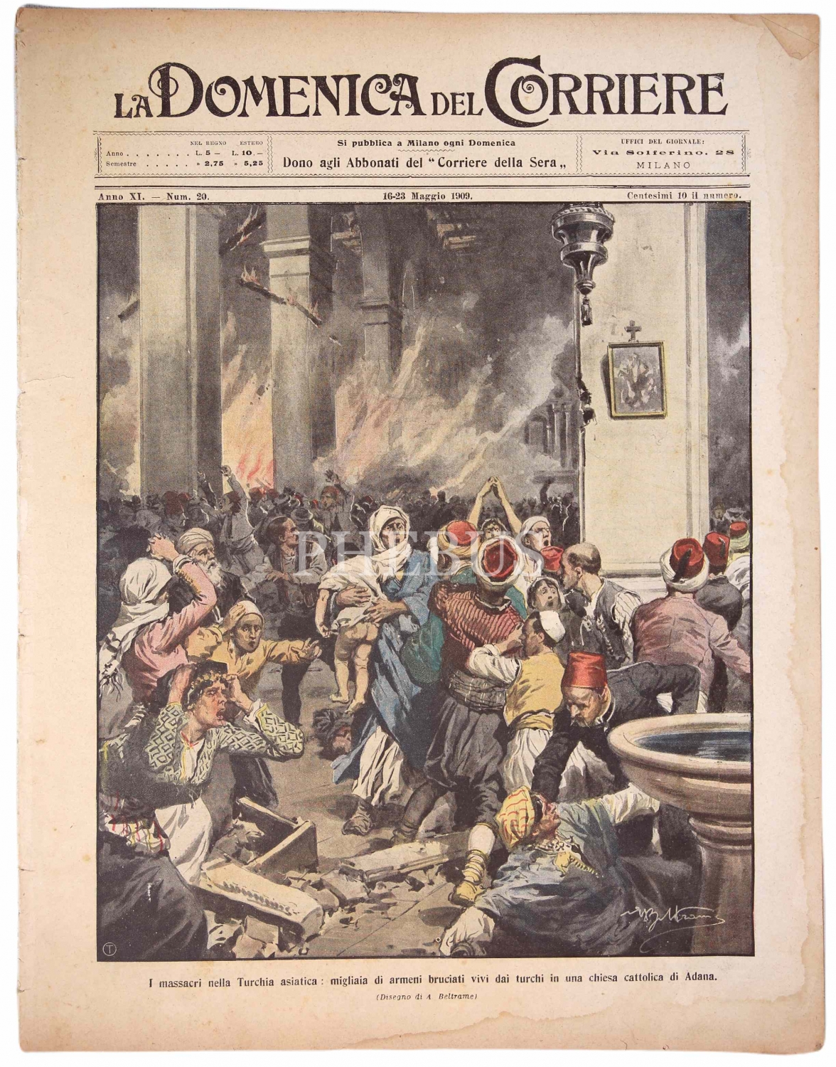 İtalyanca La Domenica del Corriere, Kapak: Asya Türkiye'sinde Katliamlar: Adana'da bir Katolik kilisesinde Türkler tarafından diri diri yakılan binlerce Ermeni, 16 sayfa, 29x37 cm