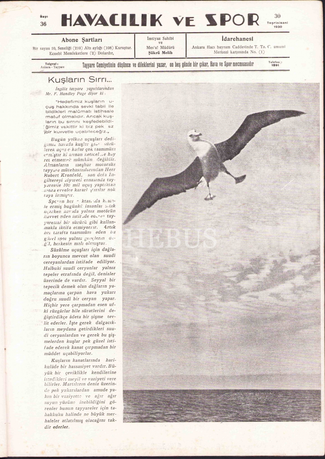 Havacılık ve Spor, Kapak: Kuşların Sırrı, 16 sayfa, 30 Teşrinisani 1930 tarihli, 24x34 cm