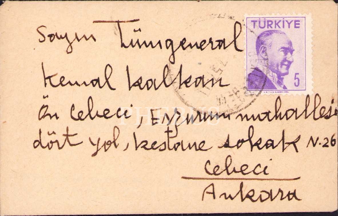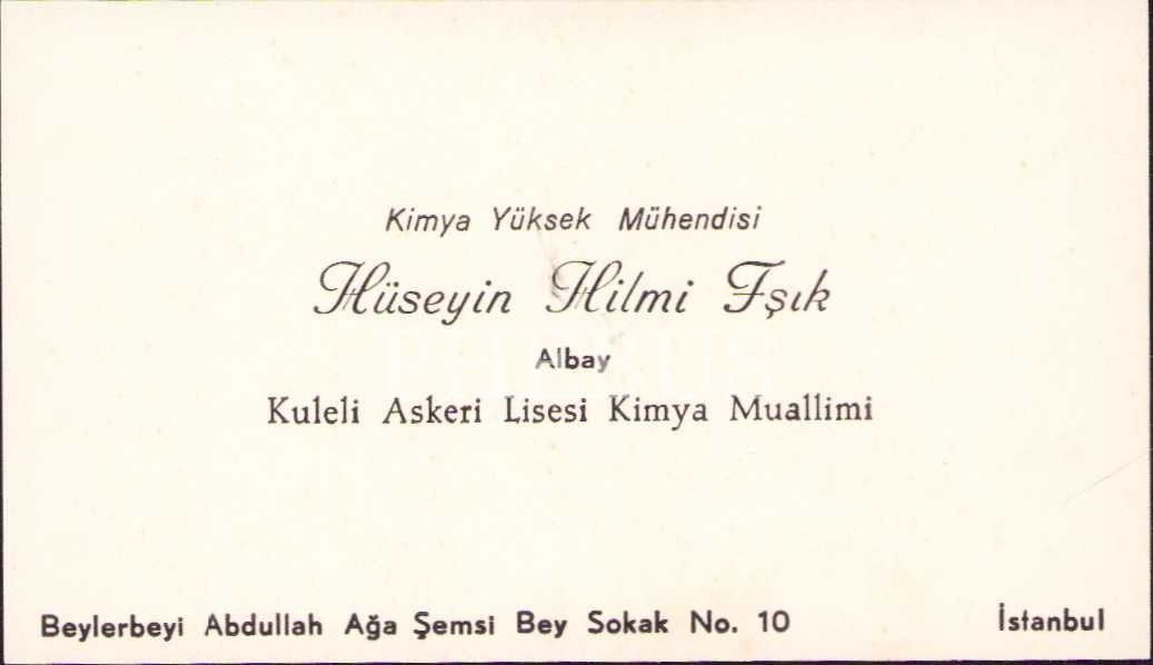 Hüseyin Hilmi Işık'a ait kartvizit, arkası el Osmanlıca ithaflı, Tümgeneral Kemal Kalkan'a gönderilmiş zarfta, 1379 tarihli, 8x4 cm