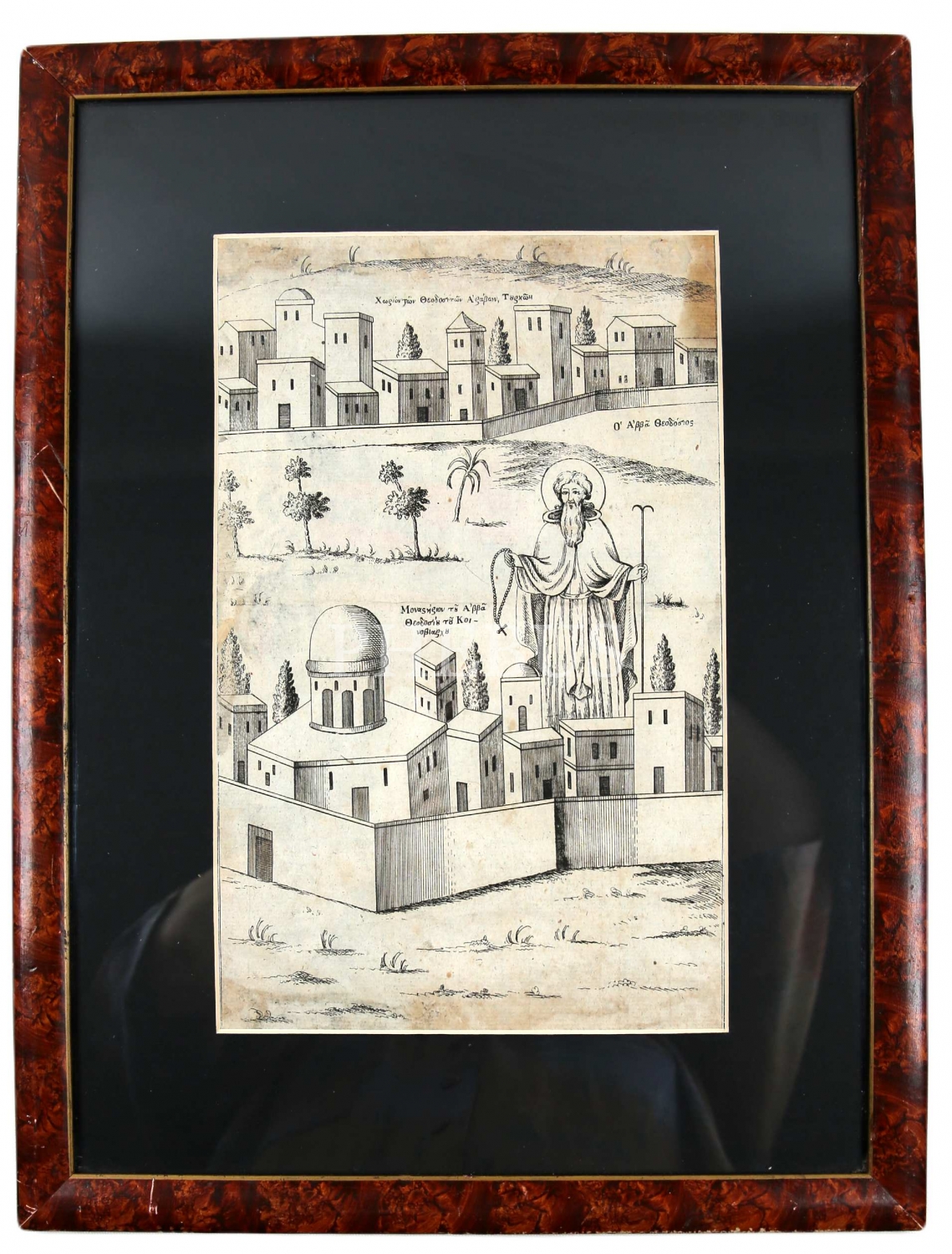 Kapadokyalı Aziz Thodosius'un Kudüs 'de 476 yılında inşa ettiği manastırın ve azizin remi bulunan taş baskı gravür, çerçeveli,