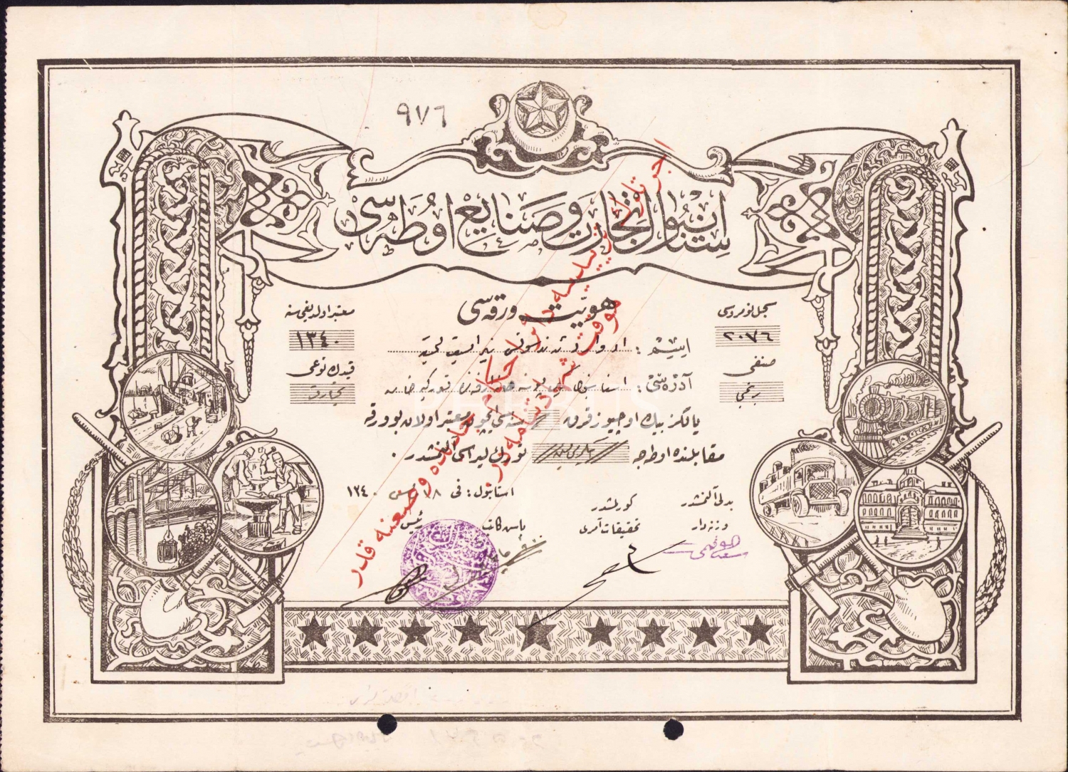 Osmanlıca Ticaret ve Sanayi Odası Kimlik Varakası, 1340 tarihli, 30x22 cm