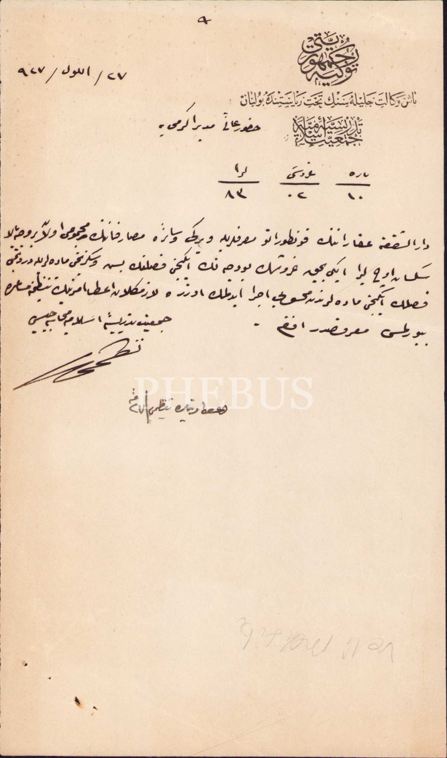 Cemiyet-i Tedrisiye-yi İslamiye Muhasebecisi imzalı Darüşşafaka Akaretleri ile ilgili 1927 tarihli Osmanlıca belge, 13x22 cm