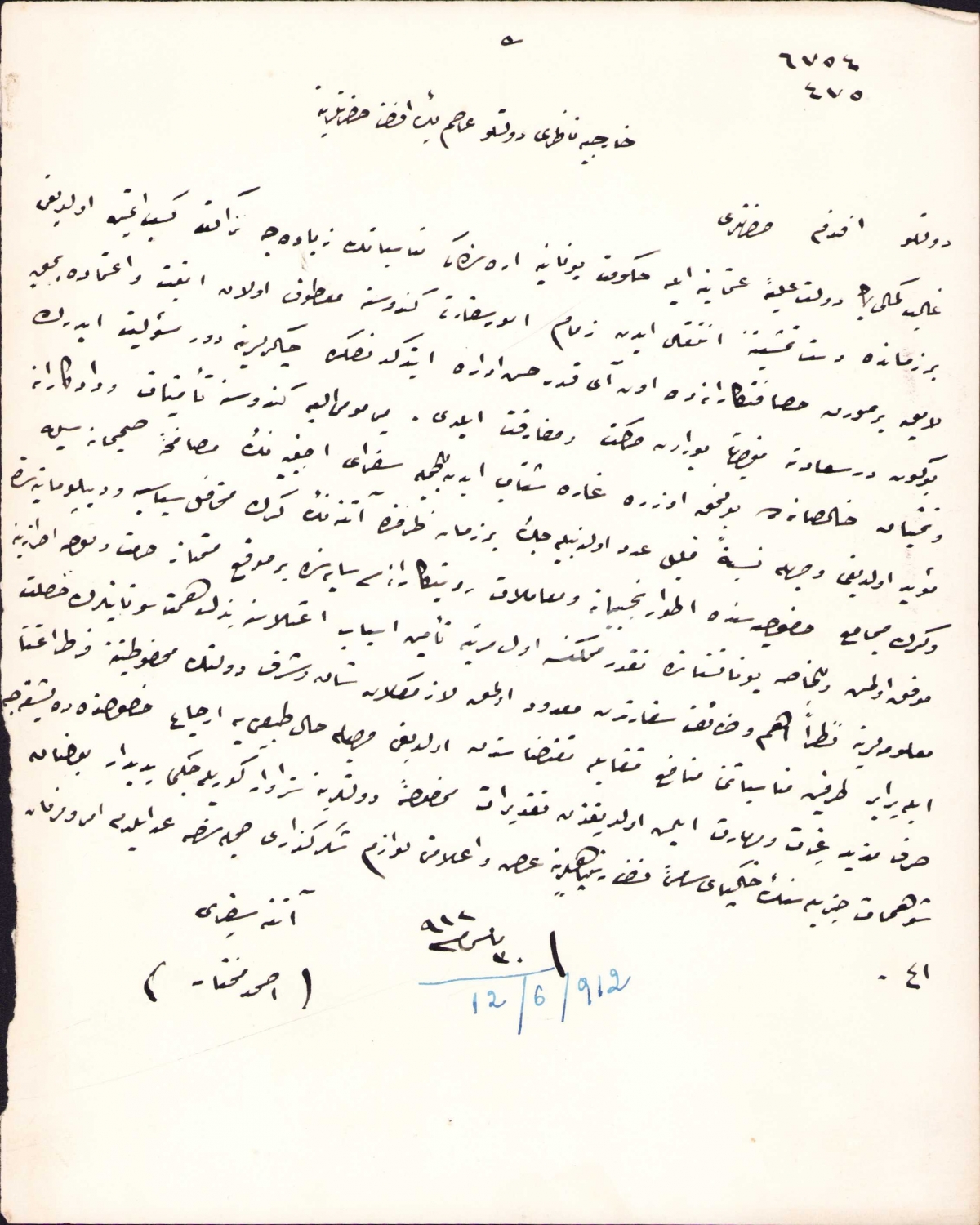 Atina Sefiri Ahmed Muhtar'ın el yazısıyla Hariciye Nazırı Asım Bey'e yazılmış Osmanlıca belge, 1912 tarihli, 19x24 cm