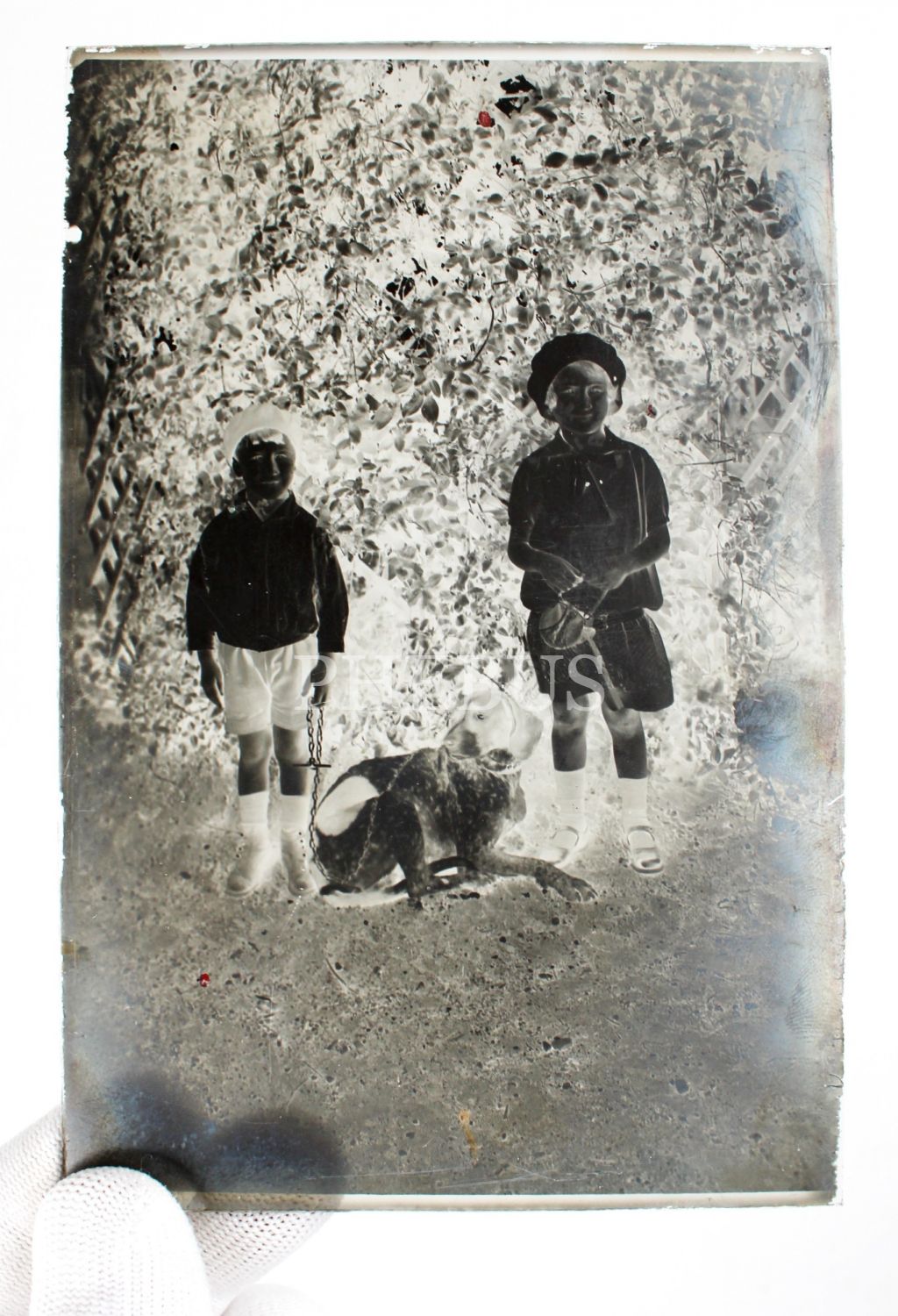 Cam negatif fotoğraf, bahçede köpekleriyle poz veren çocuklar, 10x15cm