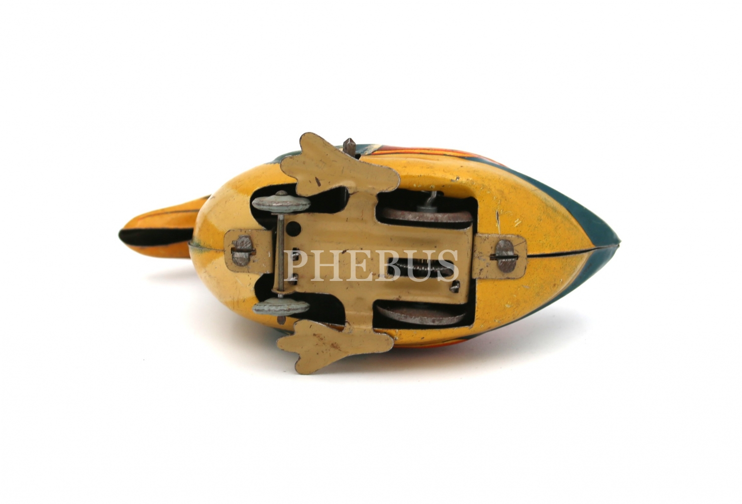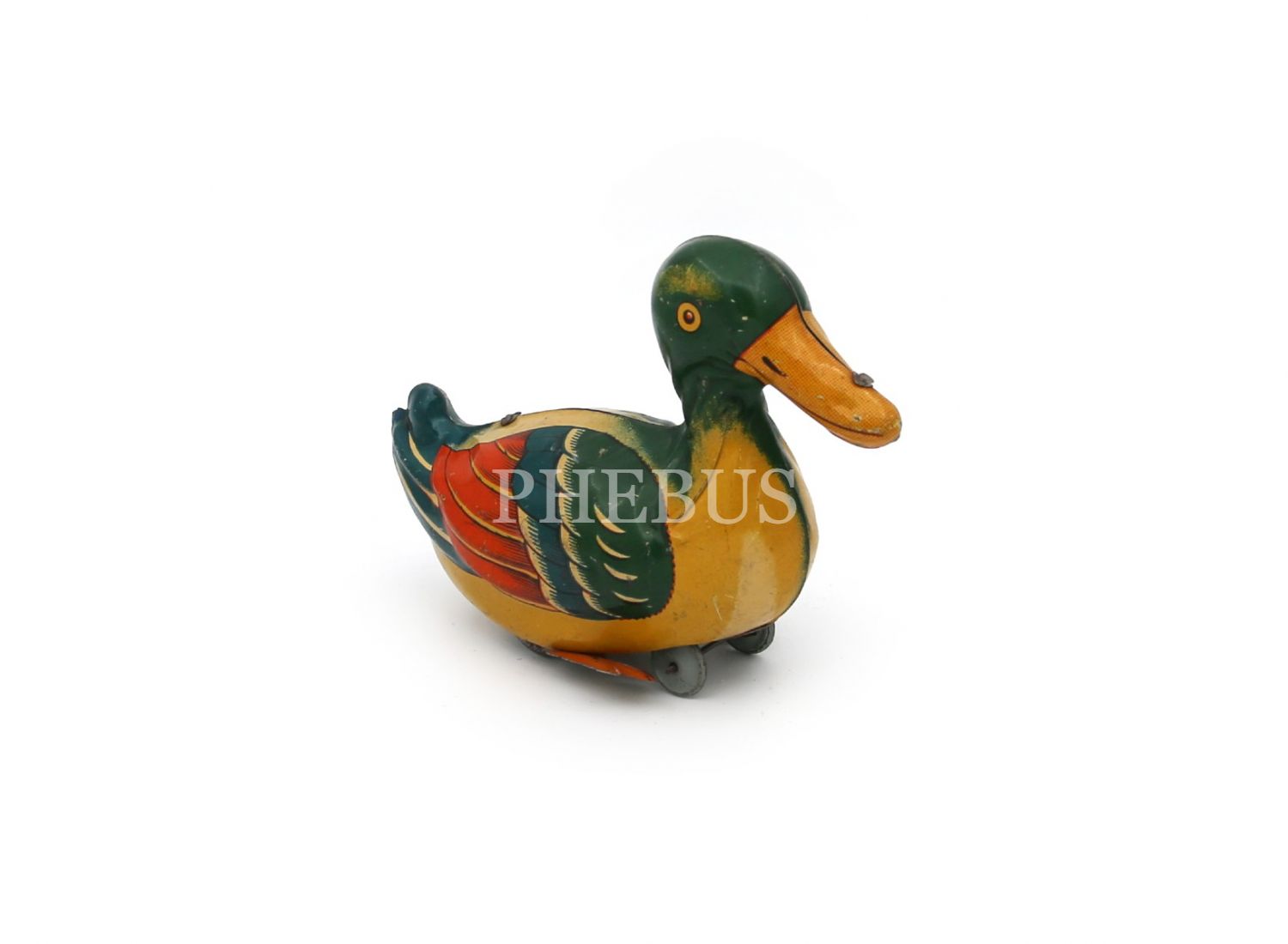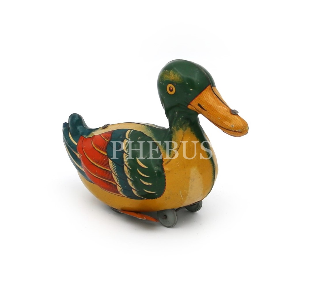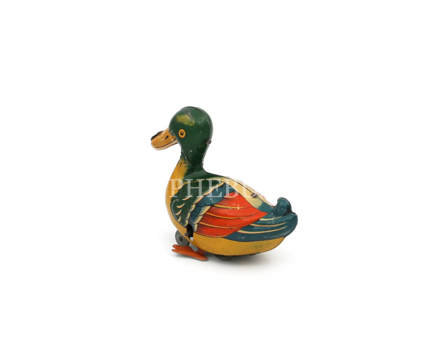 Kurmalı teneke oyuncak ördek, kurma mekanizması haliyle, 14x10x6 cm