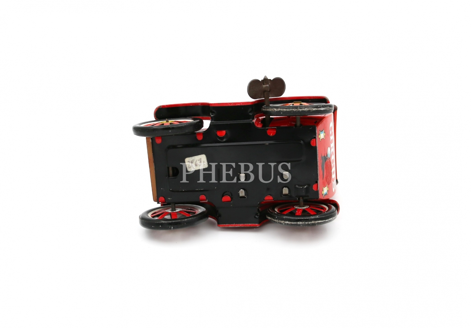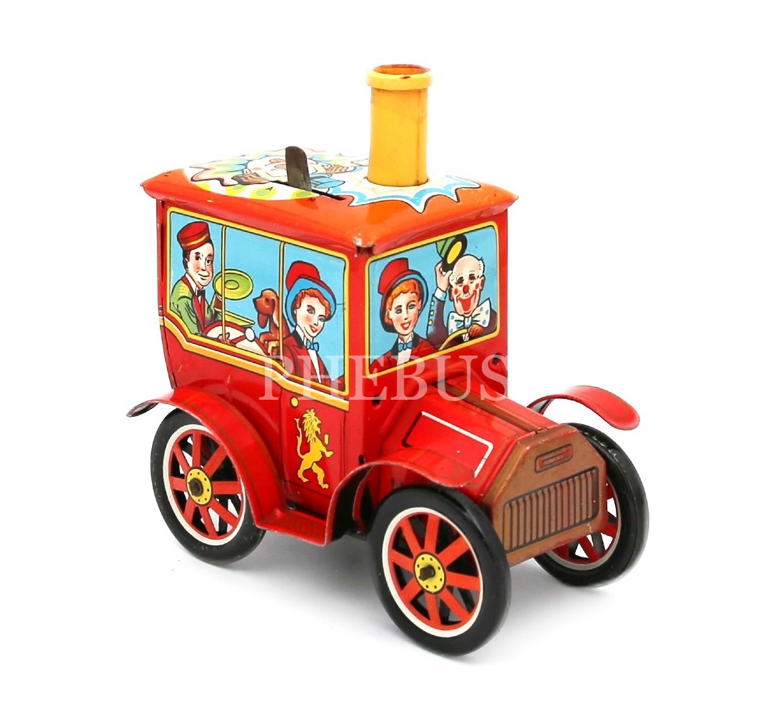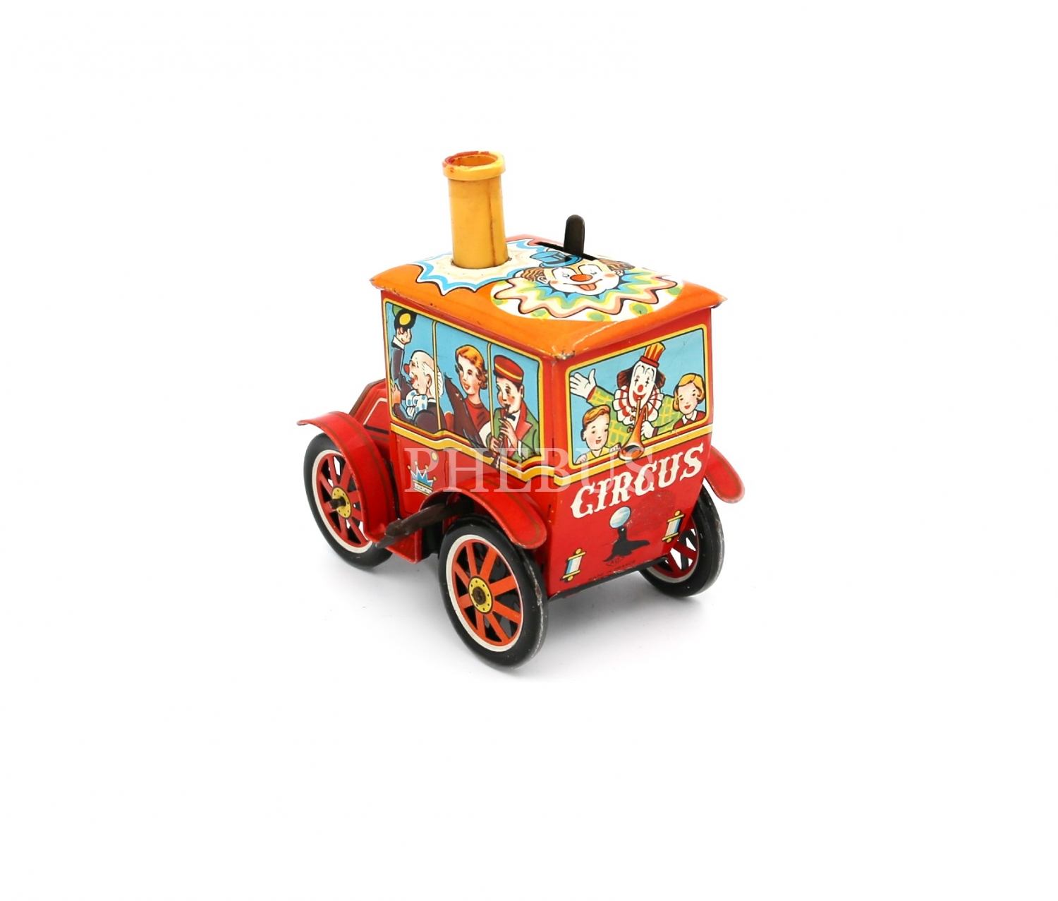 Fransız malı, kurmalı, çalışır durumda teneke oyuncak sirk arabası, 12x12x8 cm
