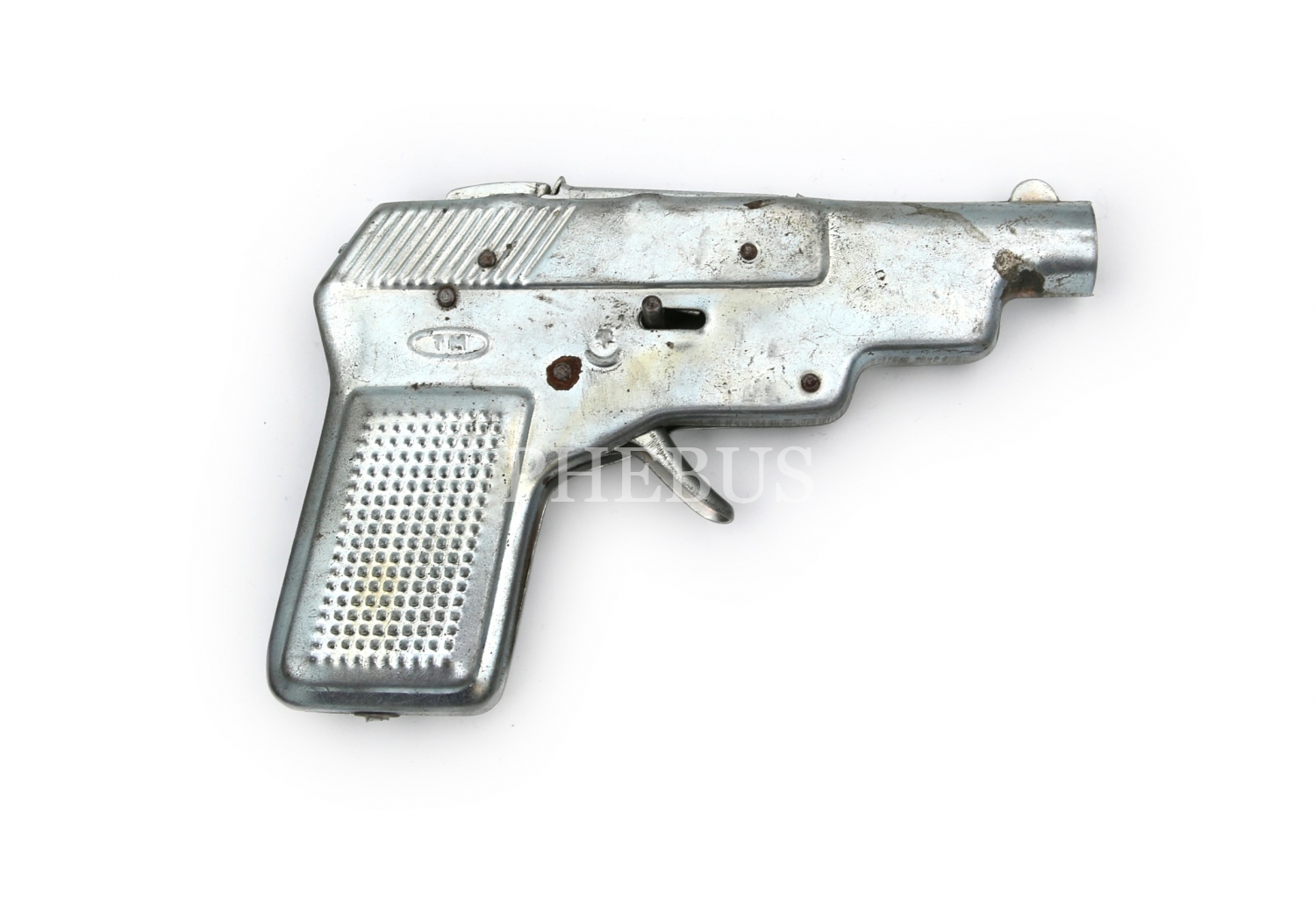Türk malı, Alasya marka, ay yıldız kabartmalı, teneke oyuncak tabanca, 15x9x2 cm