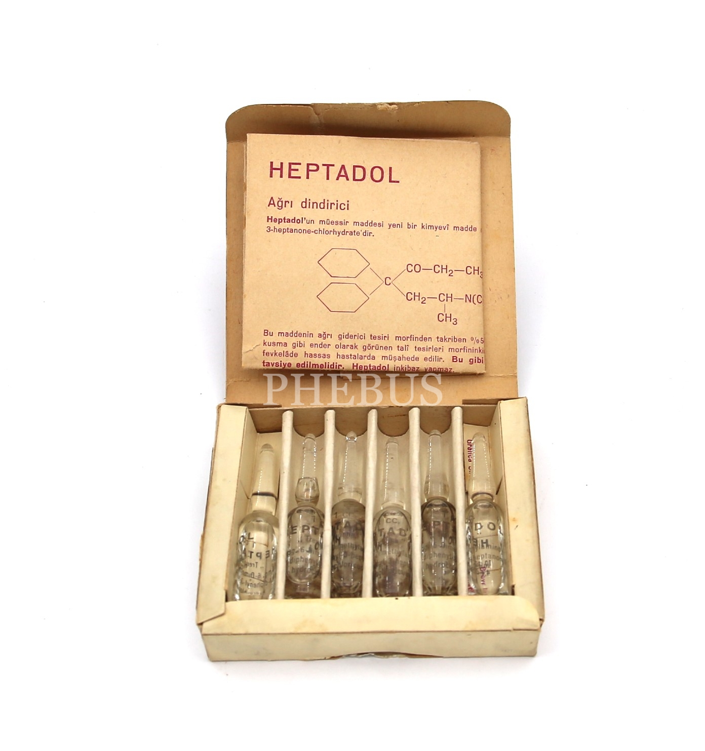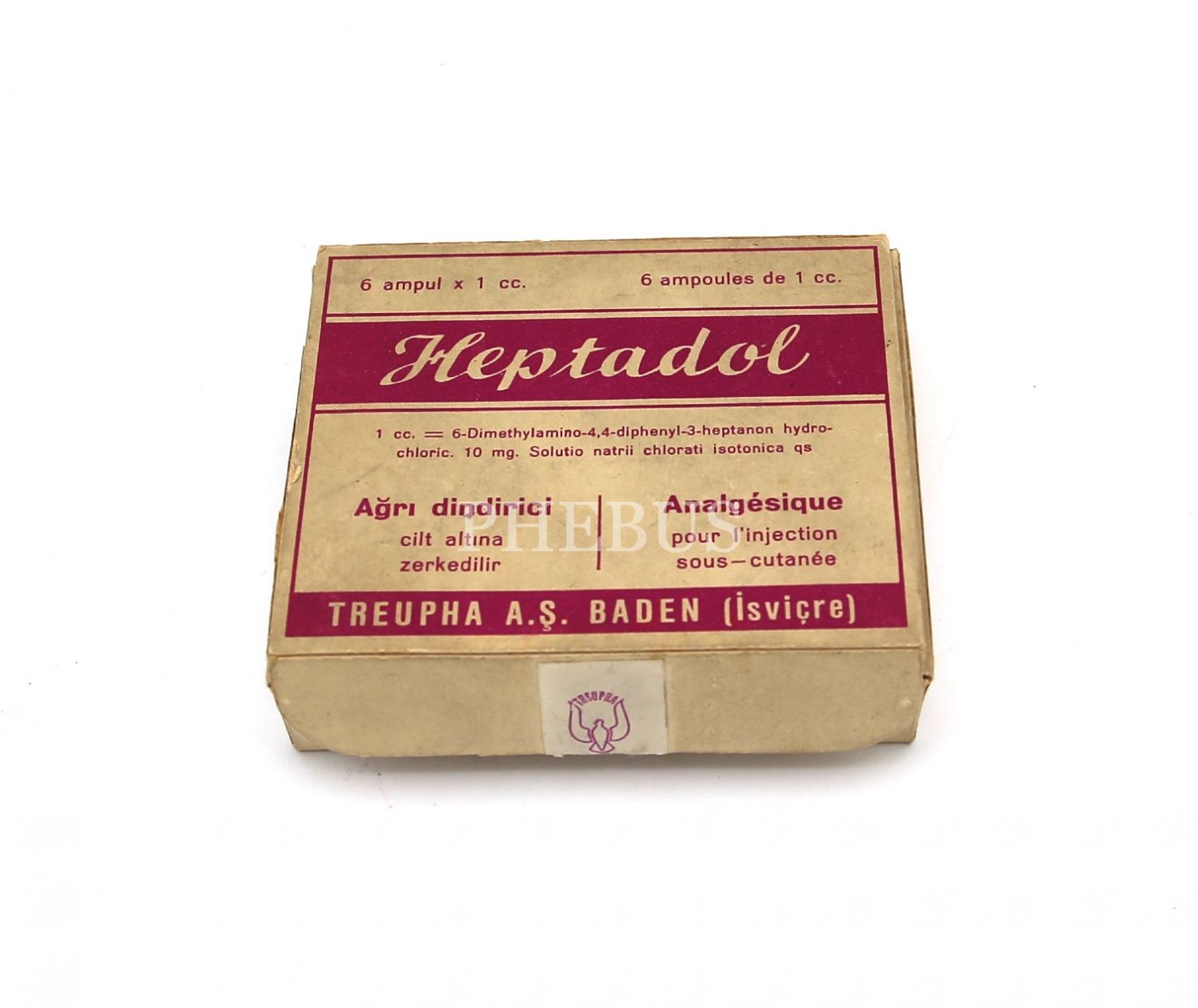 İsviçre üretim, Fransızca ve Türkçe yazılmış, Heptadol Ağrı Dindirici, içi dolu 6 ampul iğne, 8x6x2 cm