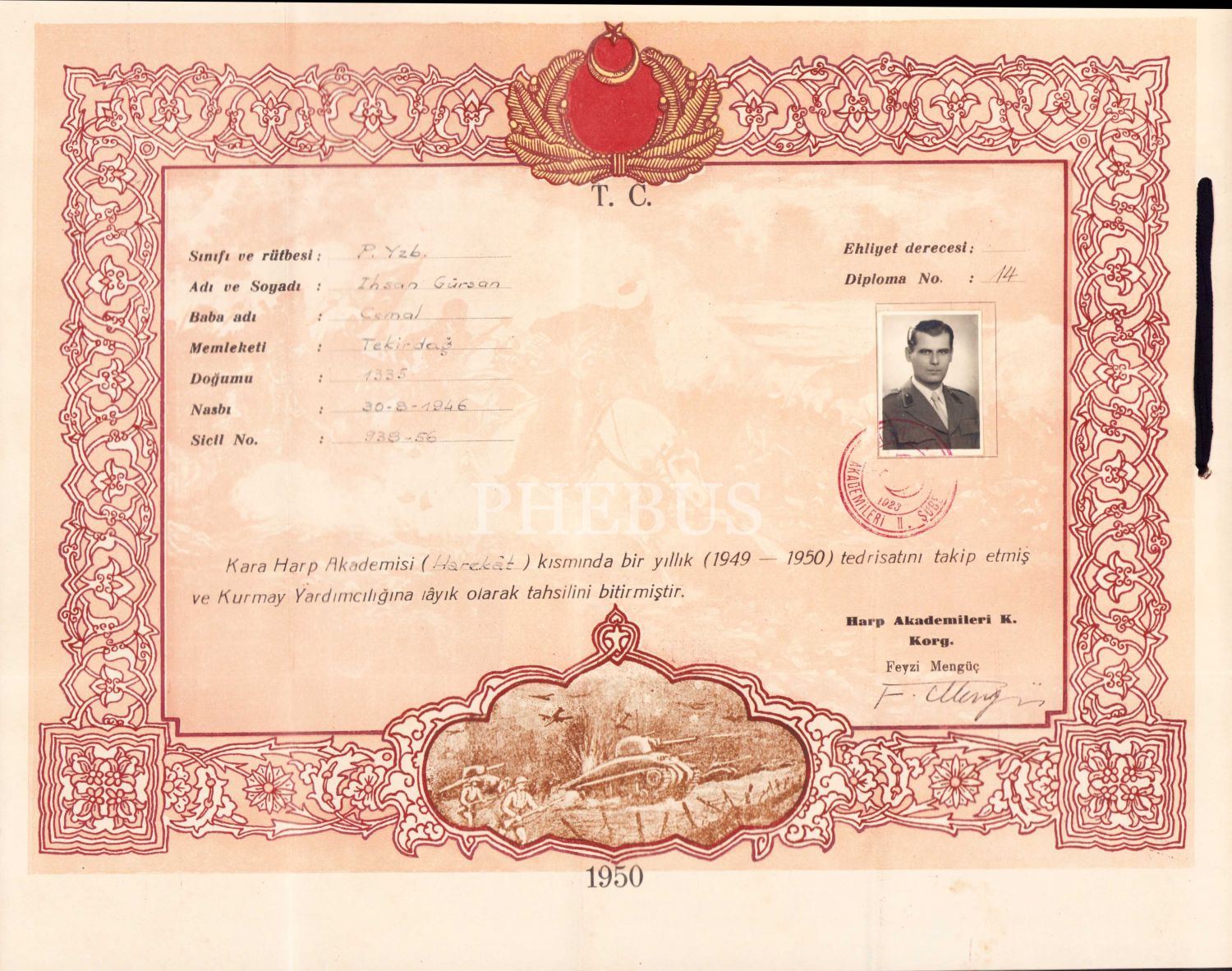 Kara Harp Okulu Akademisi Kurmaylık Diploması, 1950 tarihli, fotoğraflı, orjinal kabında, 36,5x30cm