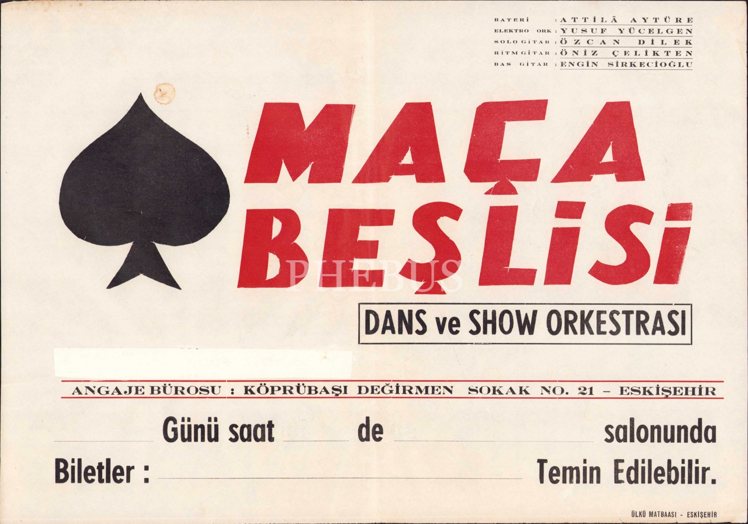 Maça Beşlisi Dans ve Show Orkestrası, tanıtım afişi, Ülkü Matbaası- Eskişehir, 41x28 cm