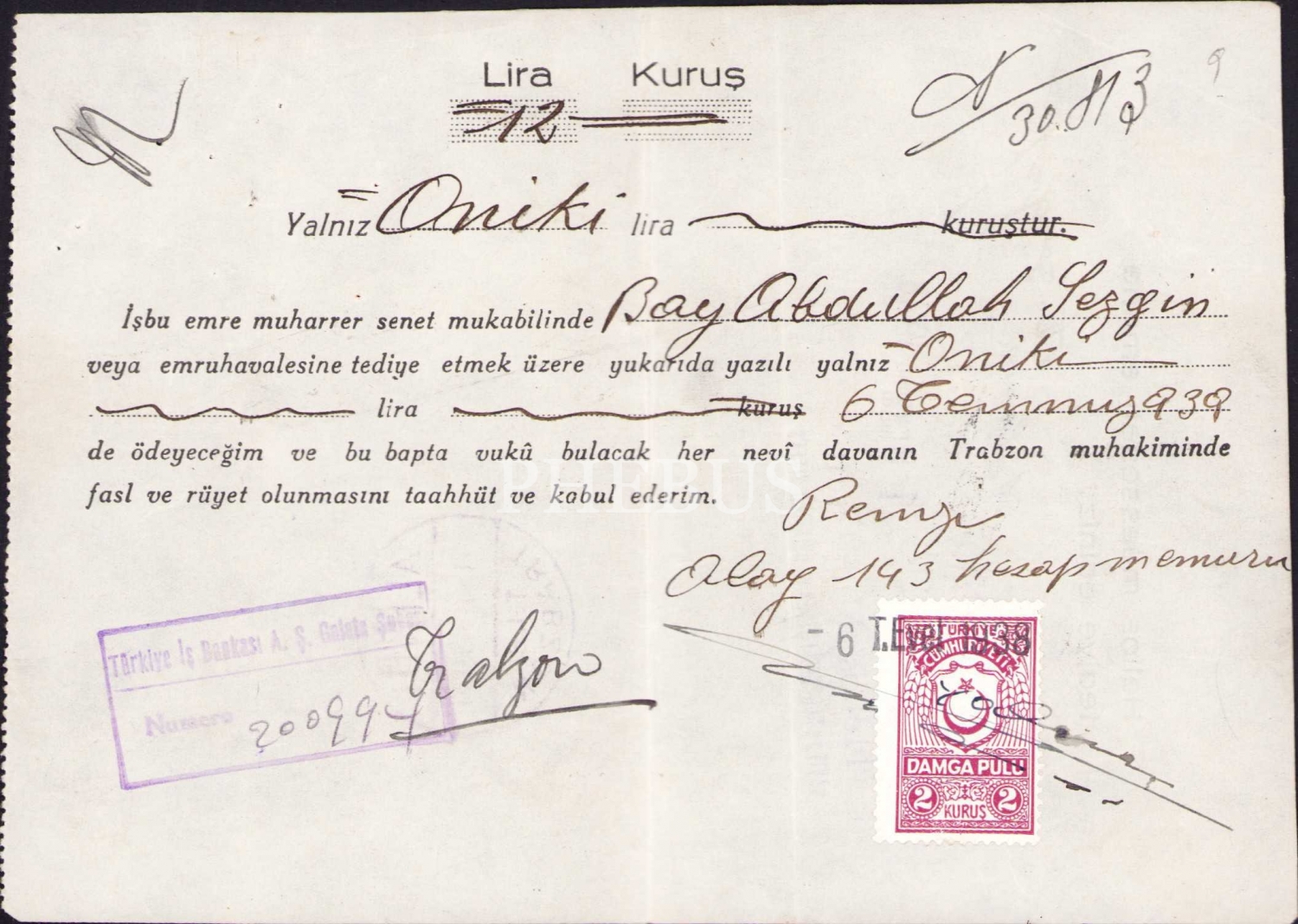 Türkiye İş Bankası Galata Şubesi damgalı, 1939 tarihli banka senedi, pullu, 17x13 cm