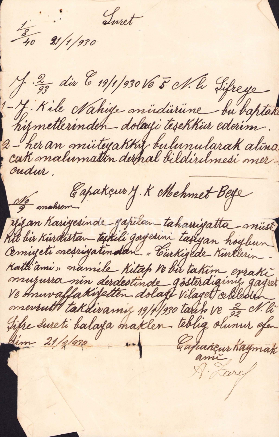 Çapakçur Kaymakamı A. Zarif imzalı 1930 tarihli belge, 17x28 cm