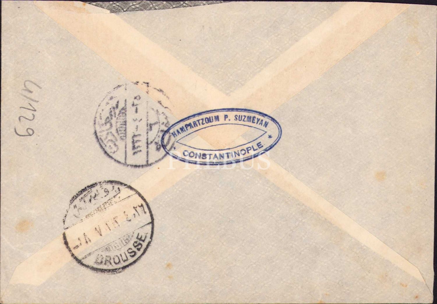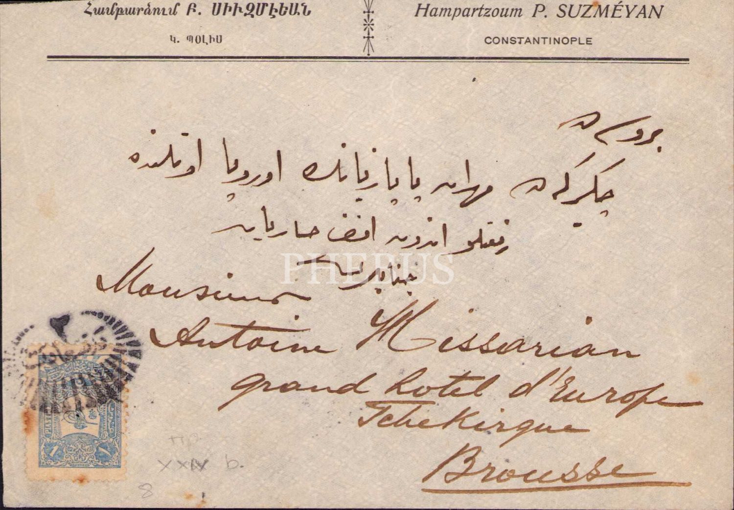 Hampartzoum P. Süzmeyan iki dilde antetli, Bursa yazılı Dersaadet damgalı zarf, üstten kesik