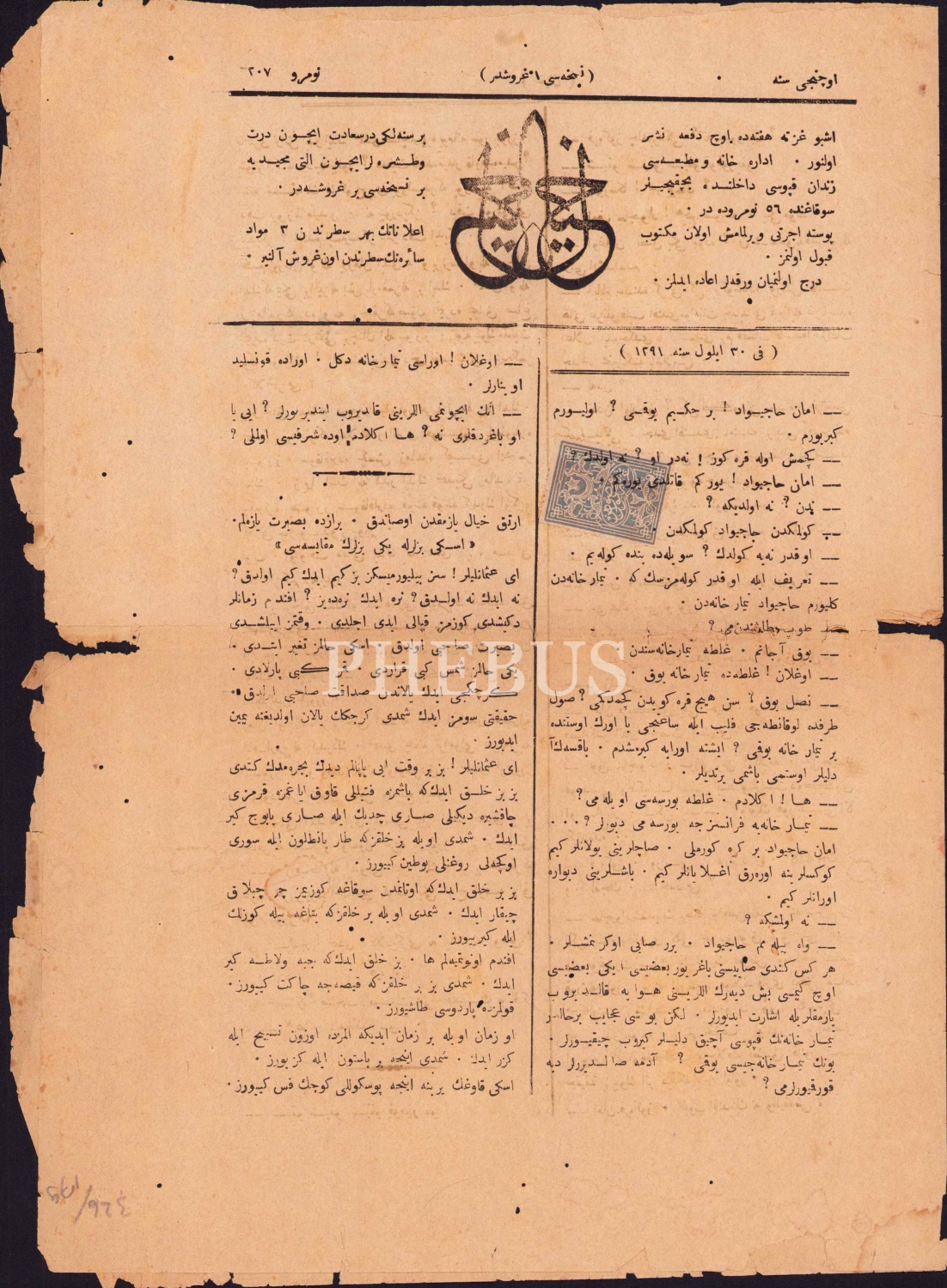 Osmanlıca Hayal Mecmuası, Numara 207, 30 Eylül 1291 tarihli, 4 sayfa, haliyle, 25x36 cm
