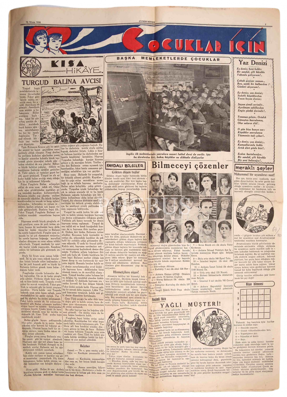 Çocuklar İçin, Cumhuriyet Gazetesi eki, 18 Nisan 1936 tarihli, 6 sayfa, 45x60 cm