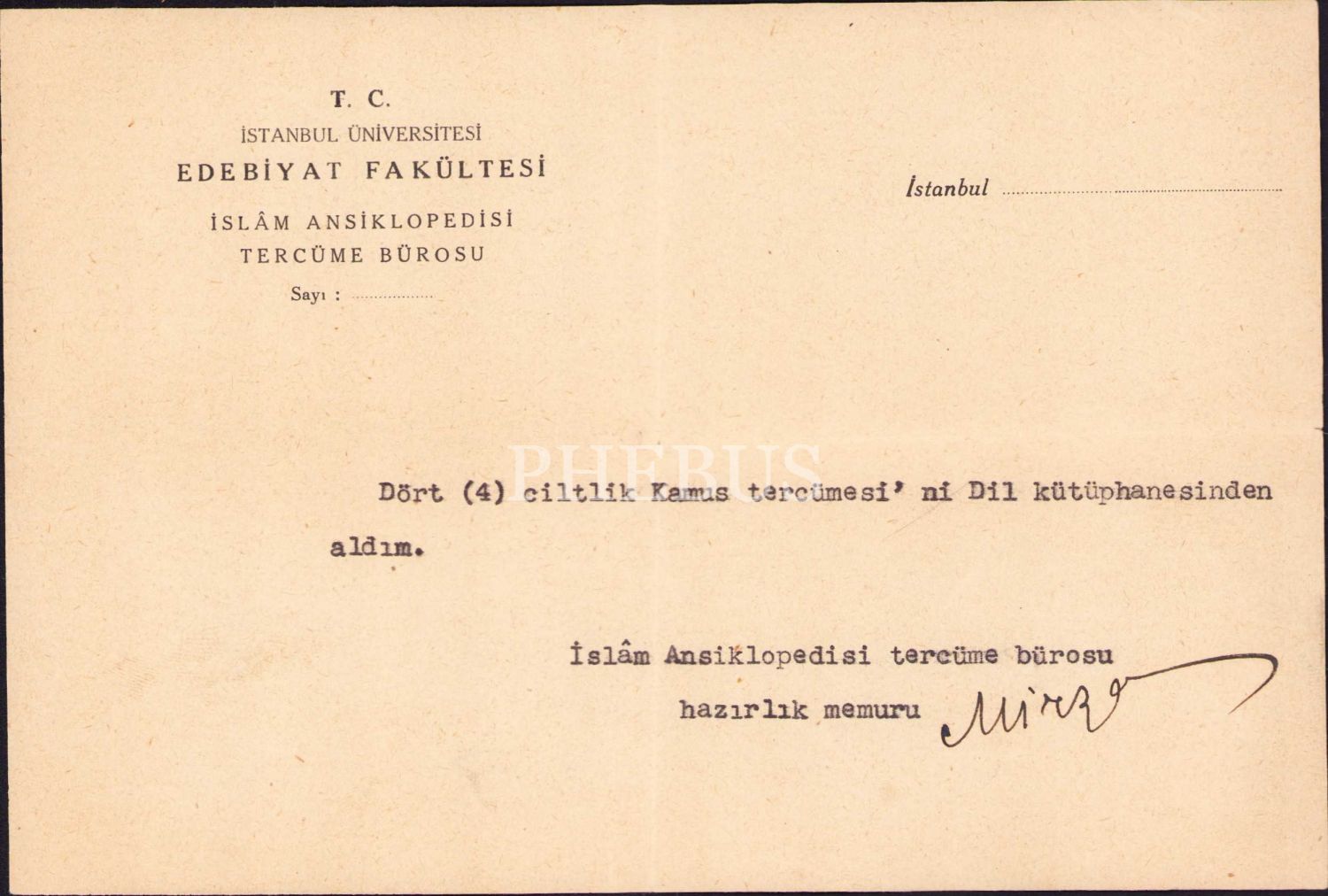 İstanbul Üniversitesi Edebiyat Fakültesi İslam Ansiklopedisi Tercüme Bürosu antetli belge, İslam Ansiklopedisi tercüme bürosu memuru imzalı, 21x14 cm