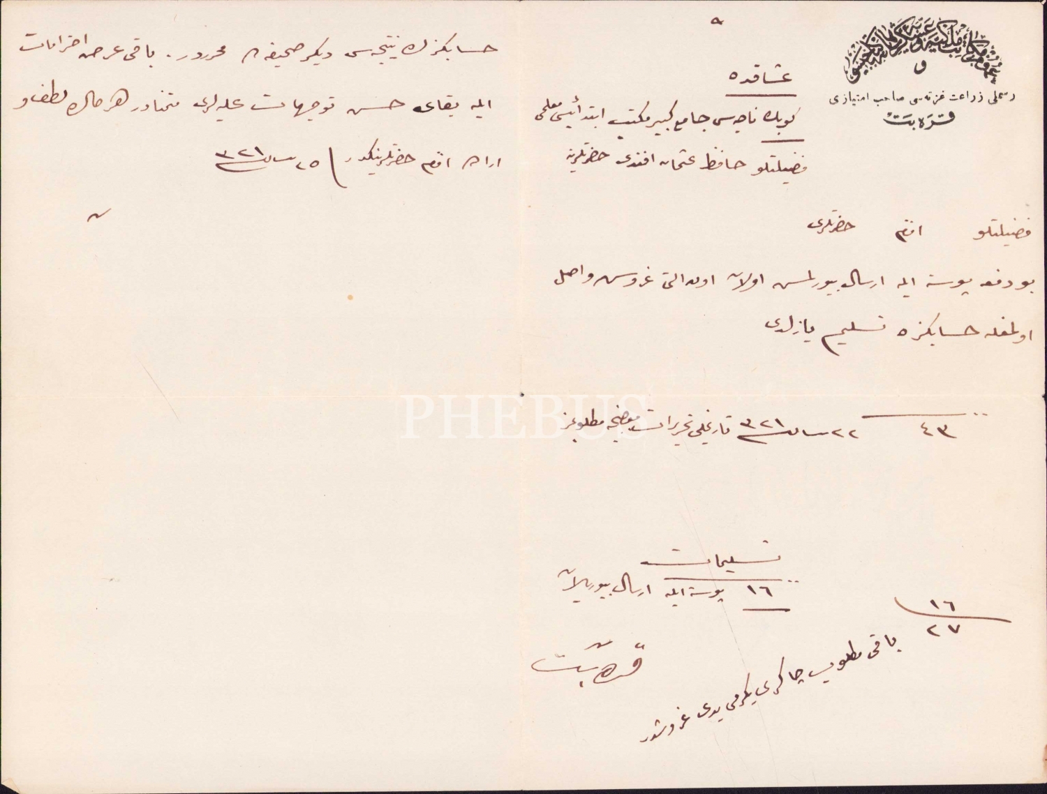 Osmanlıca Resimli Ziraat Gazetesi antetli, derginin imtiyaz sahibi Karabet imzalı, 1321 tarihli belge, 26x20 cm