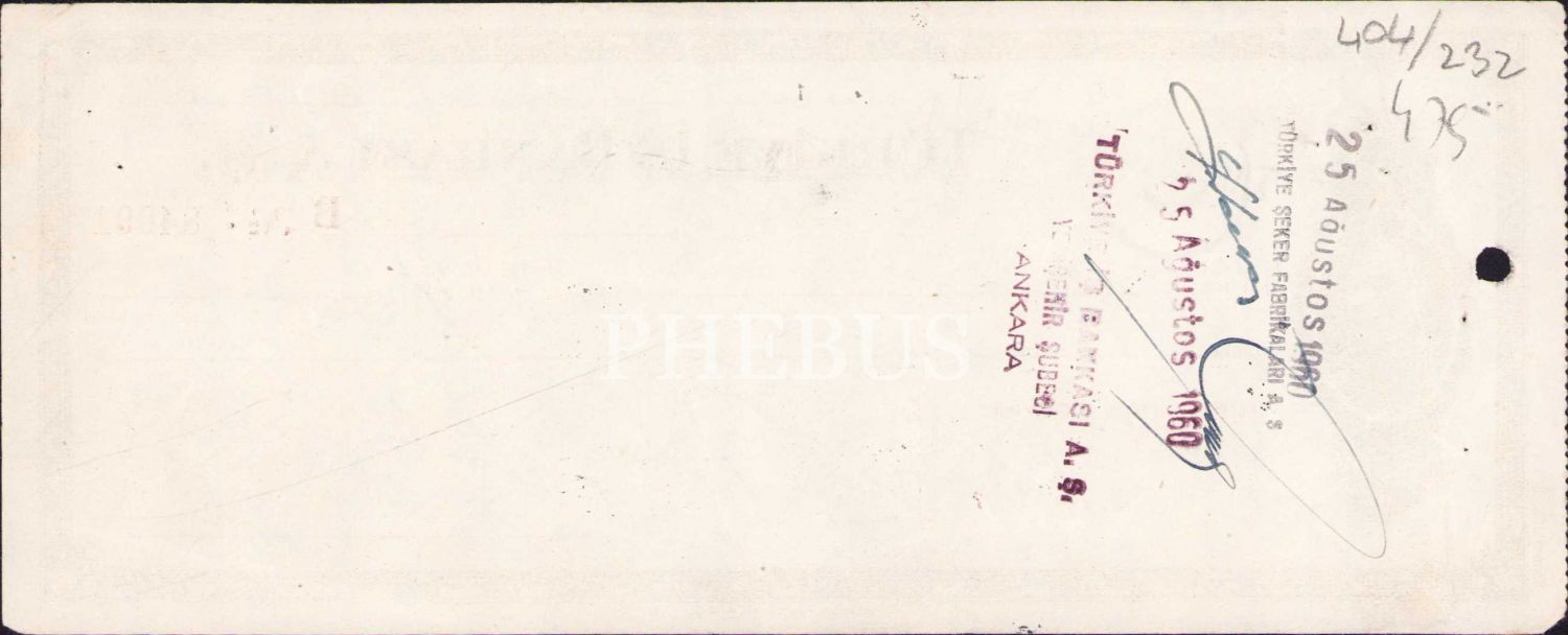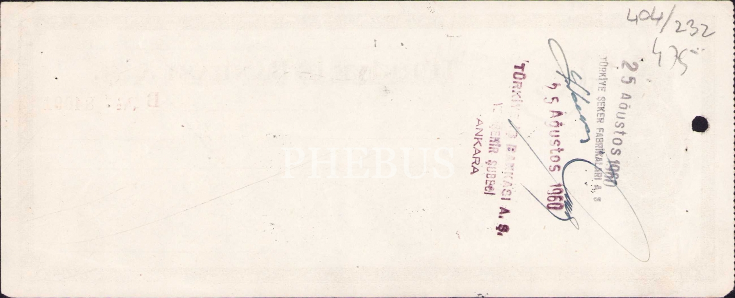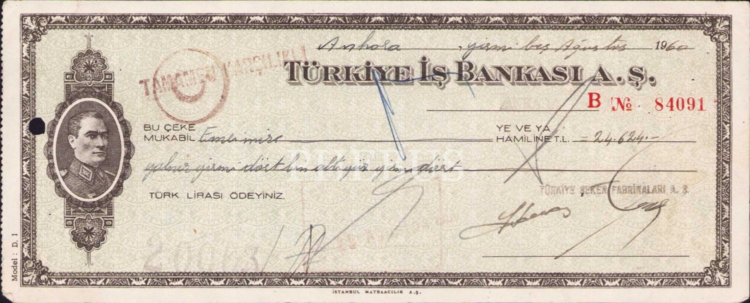 Türkiye İş Bankası çek, 1960 tarihli, Atatürk görselli, 22x9 cm