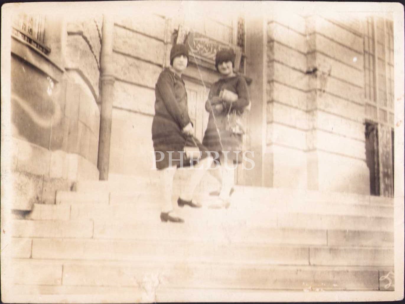 Osmanlıca .... veznesi yazılı tabele önünde hatıra fotoğrafı, alt kenarında yırtık var, 11,5x9,5cm