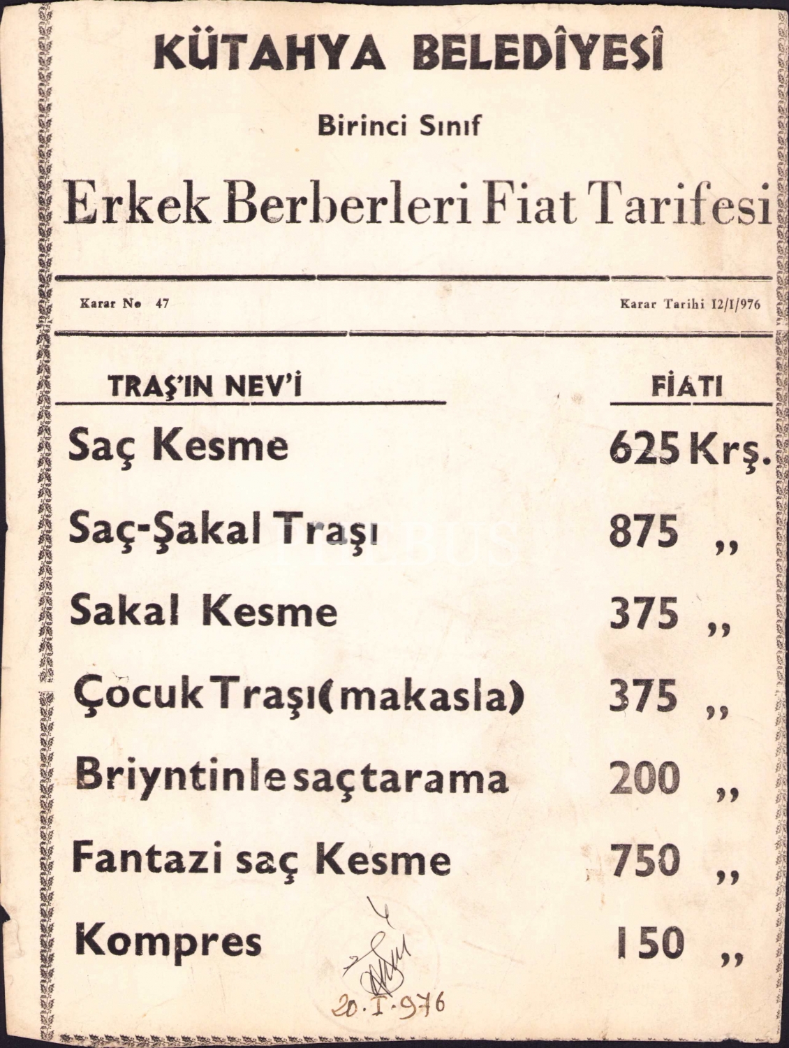 Kütahya Belediyesi Birinci Sınıf Erkek Berberleri Fiyat Tarifesi, 1976 tarihli, 22x29 cm