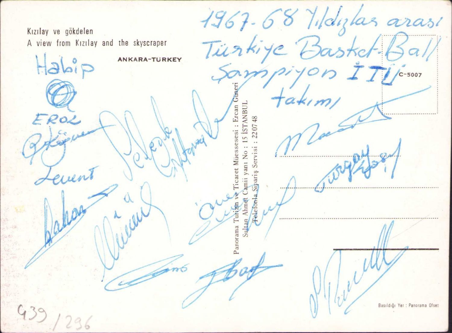Ankara Kızılay, arkası 1967-68 Yıldızlararası Türkiye Basketbol Şampiyonu İTÜ oyuncuları tarafından imzalı, 14x10 cm