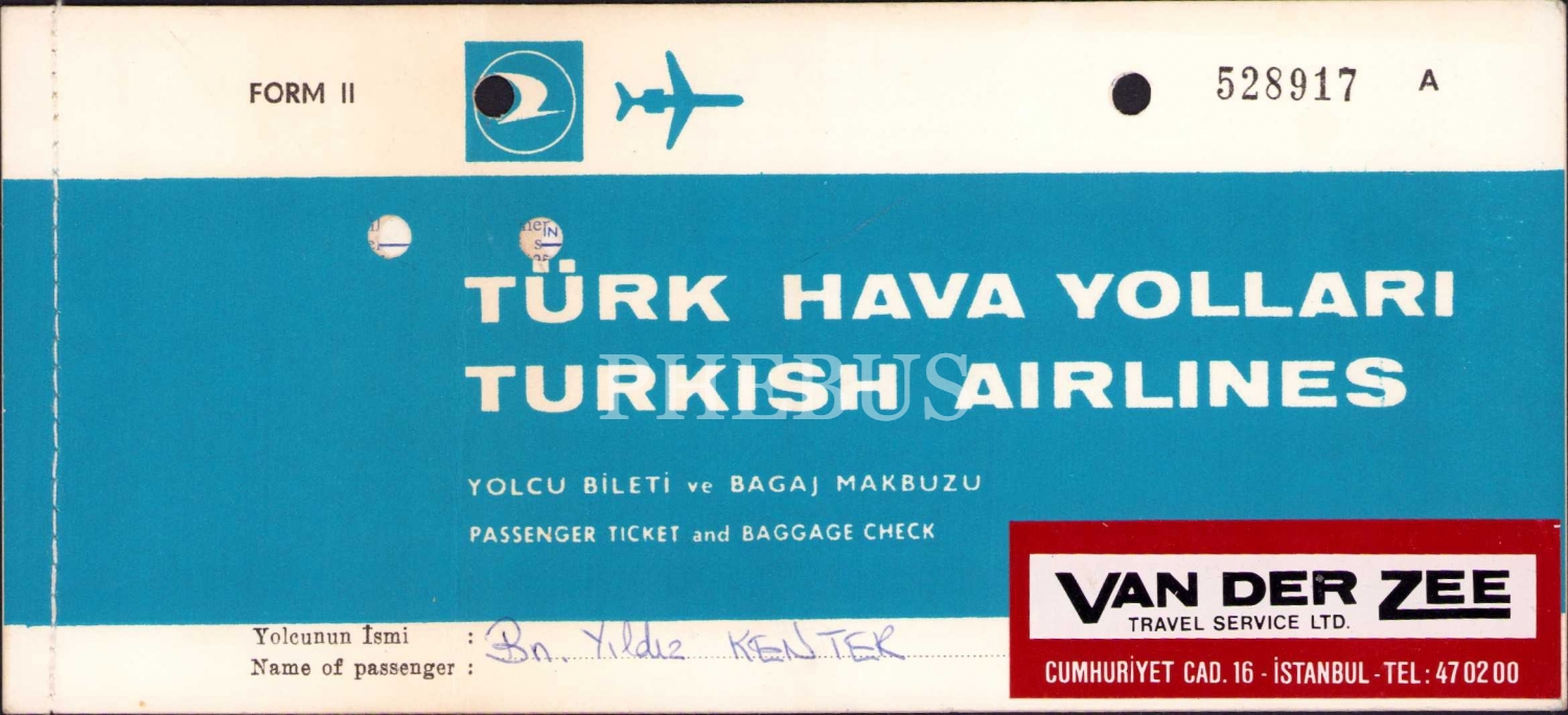 Yıldız Kenter'e ait Türk Hava Yolları yolcu bileti, 1971 tarihli, 20x9 cm
